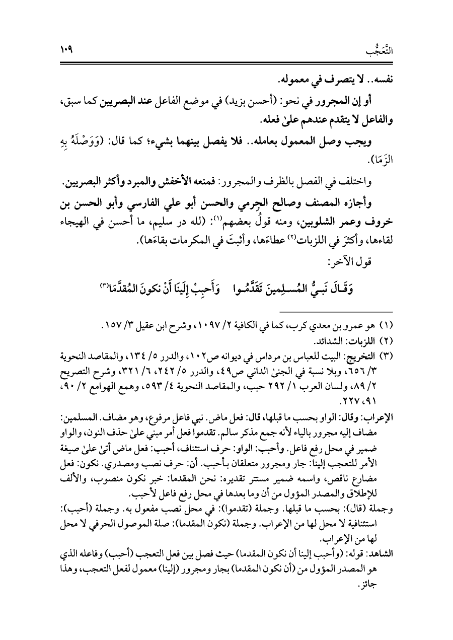 الشاهد: قوله: (وأحبب إلينا أن نكون المقدما) حيث فصل بين فعل التعجب (أحبب) وفاعله الذي هو المصدر المؤول من (أن نكون المقدما) بجار ومجرور (إلينا) معمول لفعل التعجب، وهذا جائز.