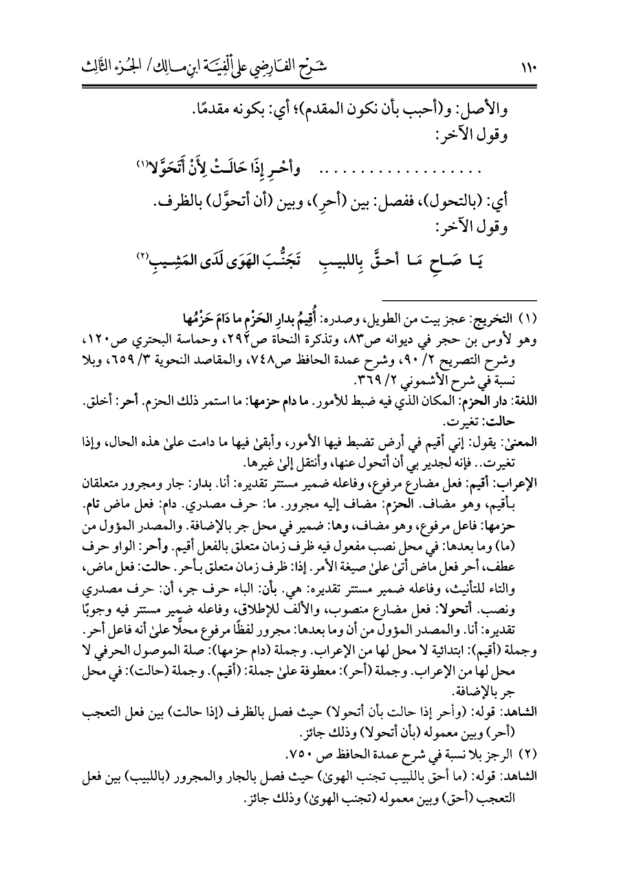 الشاهد: قوله: (وأحر إذا حالت بأن أتحولا) حيث فصل بالظرف (إذا حالت) بين فعل التعجب (أحر) وبين معموله (بأن أتحولا) وذلك جائز.