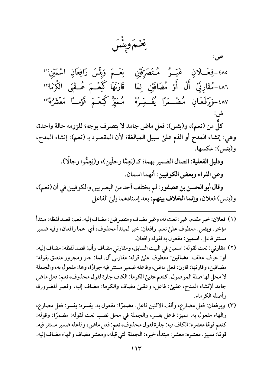 ٤٨٥ - فِعْلَانِ غَيْرُ مُتَصَرِّفَيْنِ ... نِعْمَ وَبِئْسَ رَافِعَانِ اسْمَيْنِ (¬١)