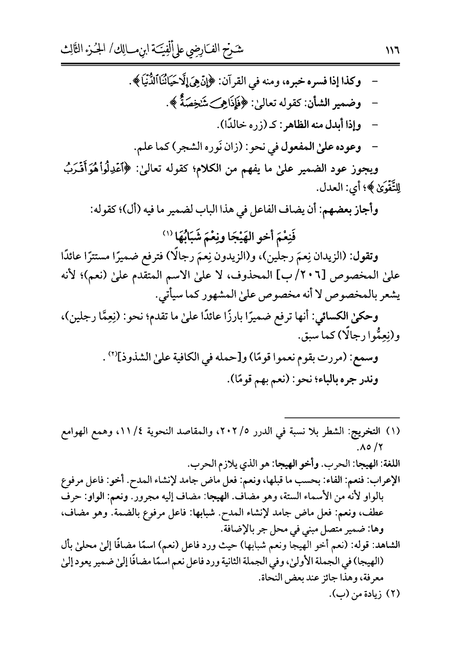 الشاهد: قوله: (نعم أخو الهيجا ونعم شبابها) حيث ورد فاعل (نعم) اسمًا مضافًا إلى محلى بأل (الهيجا) في الجملة الأولى، وفي الجملة الثانية ورد فاعل نعم اسمًا مضافًا إلى ضمير يعود إلى معرفة، وهذا جائز عند بعض النحاة.