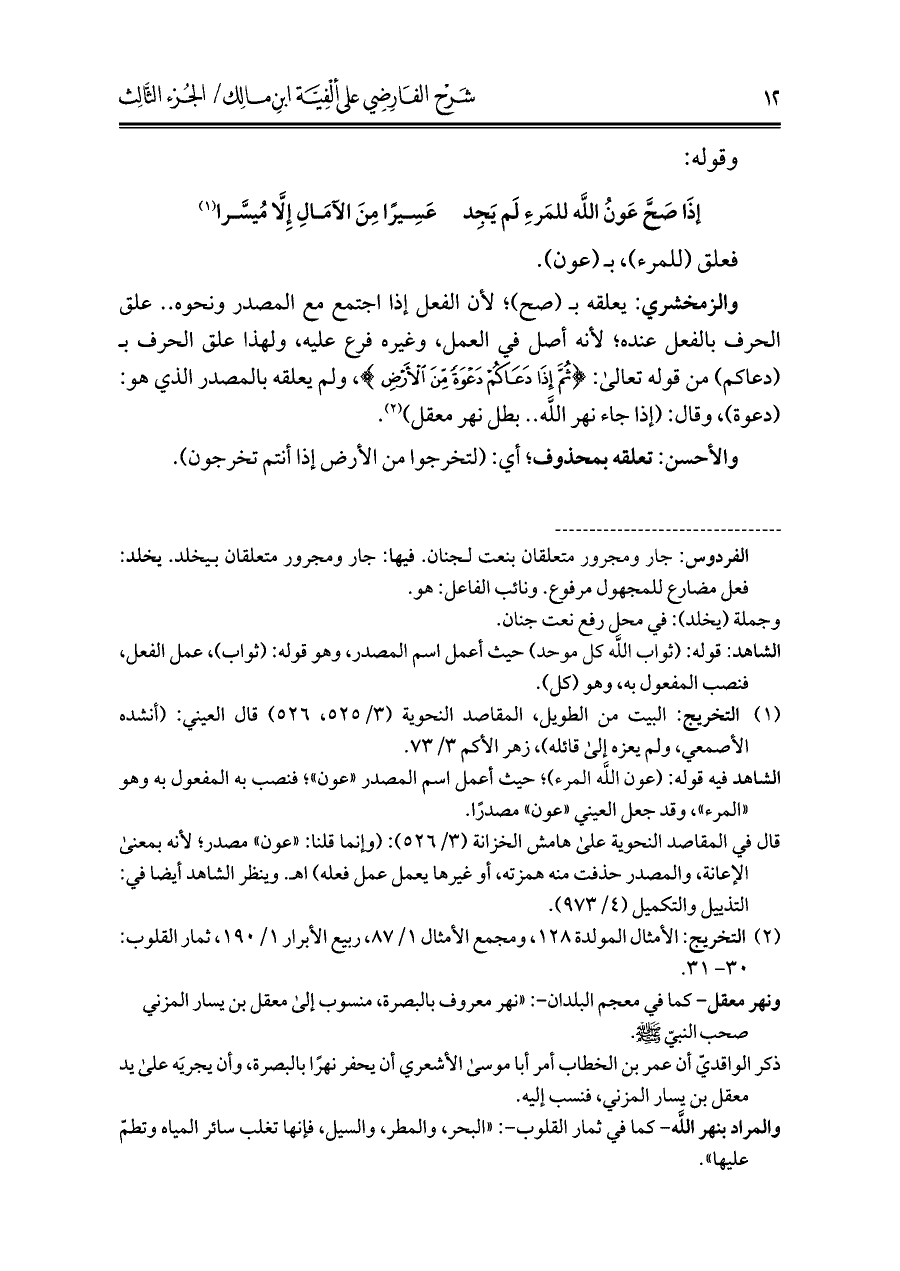 والزمخشري: يعلقه بـ (صح)؛ لأن الفعل إذا اجتمع مع المصدر ونحوه. . علق الحرف بالفعل عنده؛ لأنه أصل في العمل، وغيره فرع عليه، ولهذا علق الحرف بـ (دعاكم) من قوله تعالى: {ثُمَّ إِذَا دَعَاكُمْ دَعْوَةً مِنَ الْأَرْضِ}، ولم يعلقه بالمصدر الذي هو: (دعوة)، وقال: (إذا جاء نهر اللَّه. . بطل نهر معقل) (¬٢).