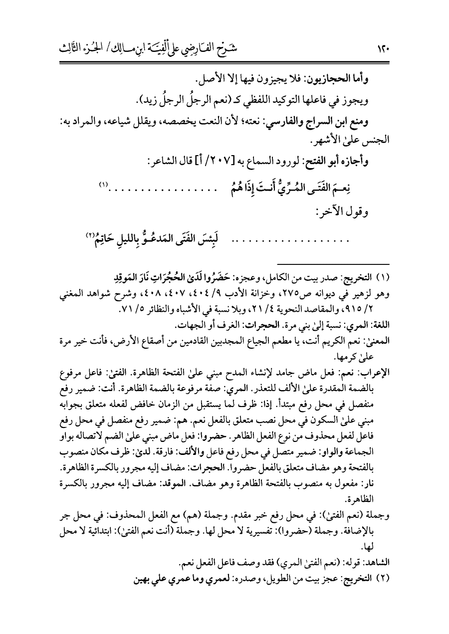 الشاهد: قوله: (نعم الفتى المري) فقد وصف فاعل الفعل نعم.
