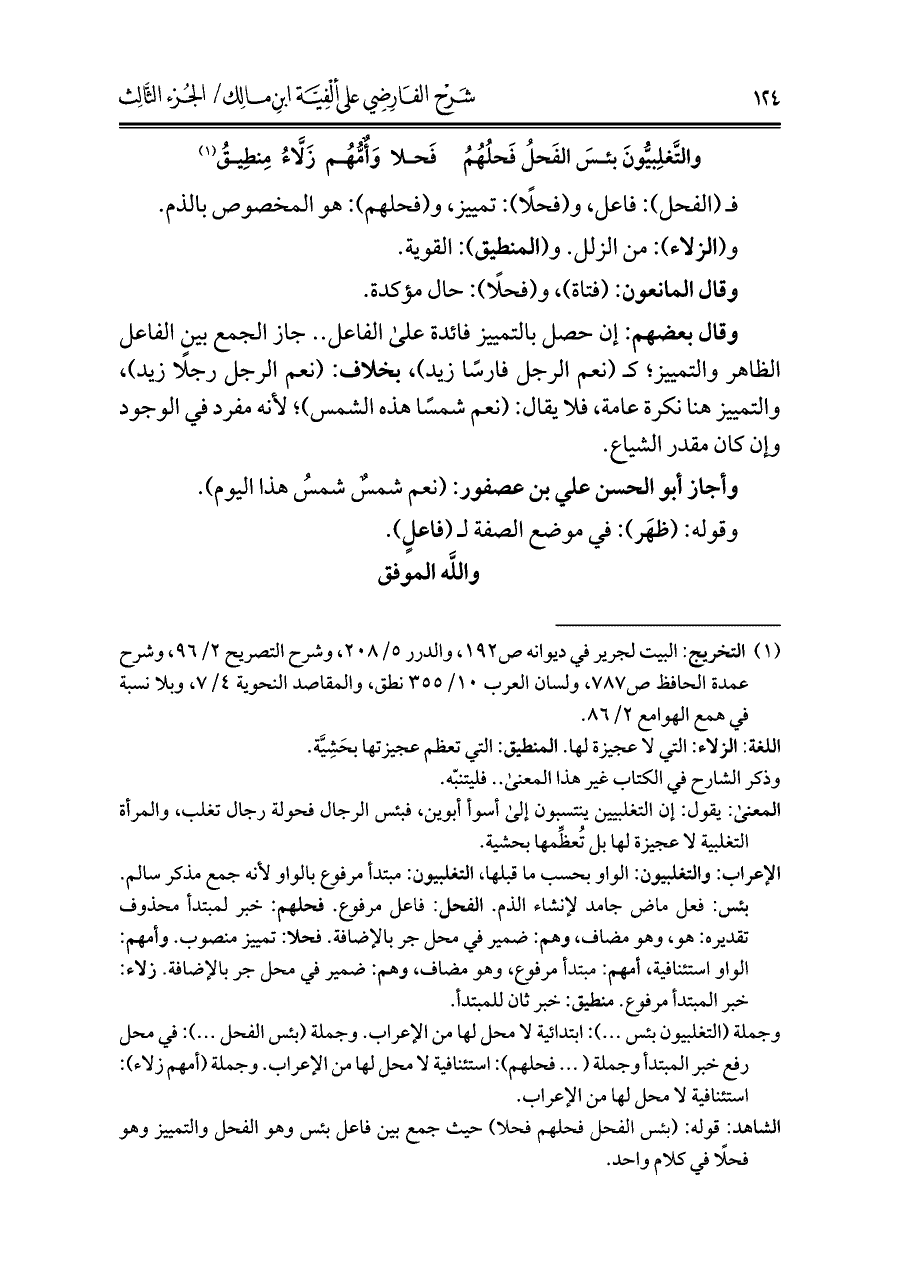 الإعراب: والتغلبيون: الواو بحسب ما قبلها، التغلبيون: مبتدأ مرفوع بالواو لأنه جمع مذكر سالم. بئس: فعل ماض جامد لإنشاء الذم. الفحل. فاعل مرفوع. فحلهم: خبر لمبتدأ محذوف تقديره: هو، وهو مضاف، وهم: ضمير في محل جر بالإضافة. فحلا: تمييز منصوب. وأمهم: الواو استئنافية، أمهم: مبتدأ مرفوع، وهو مضاف، وهم: ضمير في محل جر بالإضافة. زلاء: خبر المبتدأ مرفوع. منطيق: خبر ثان للمبتدأ.