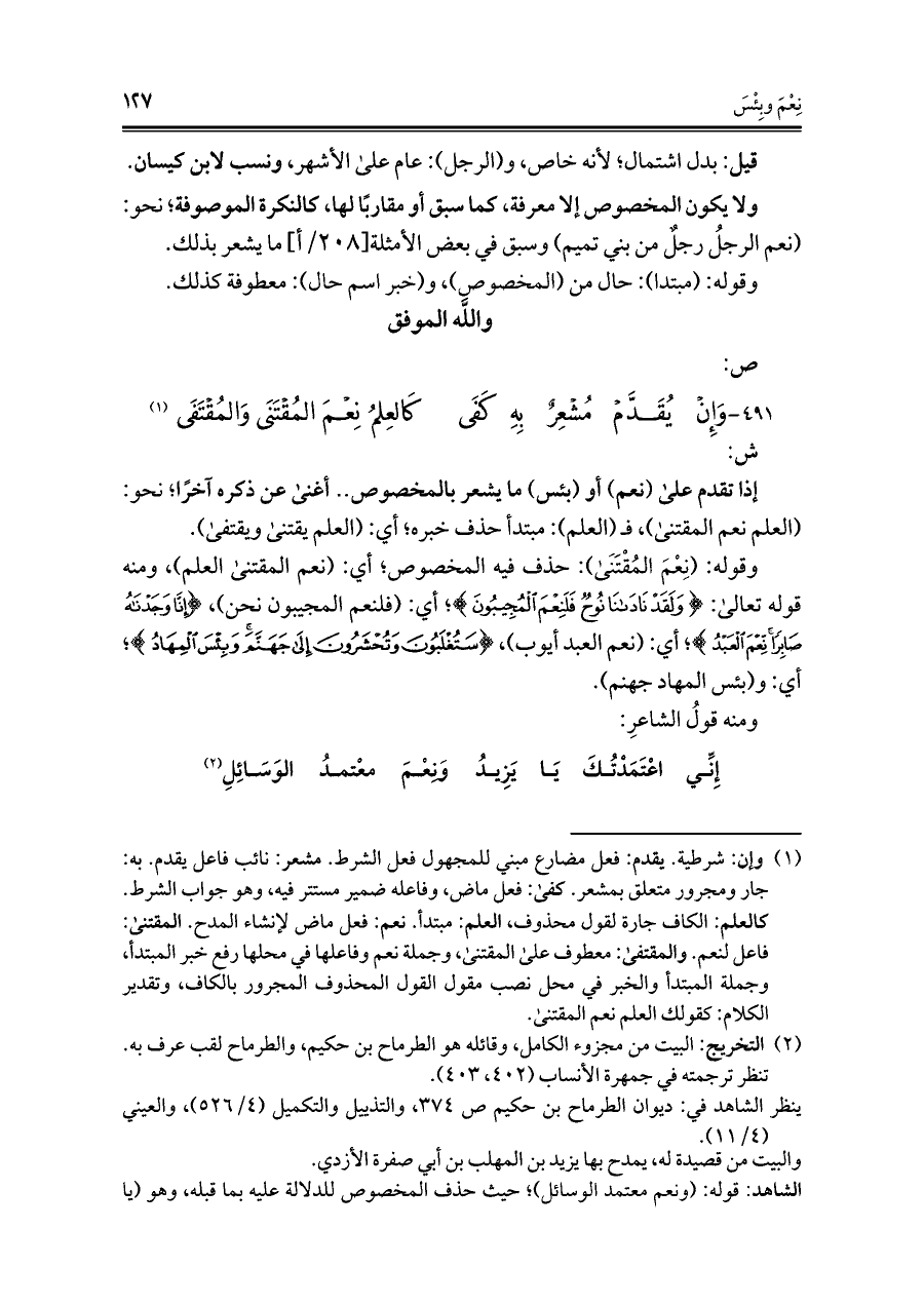 ٤٩١ - وَإِن يُقَدَّم مُشعِرٌ بِهِ كَفَى ... كَالعِلمُ نِعمَ المُقتَنَى وَالمُقتَفَى (¬١)