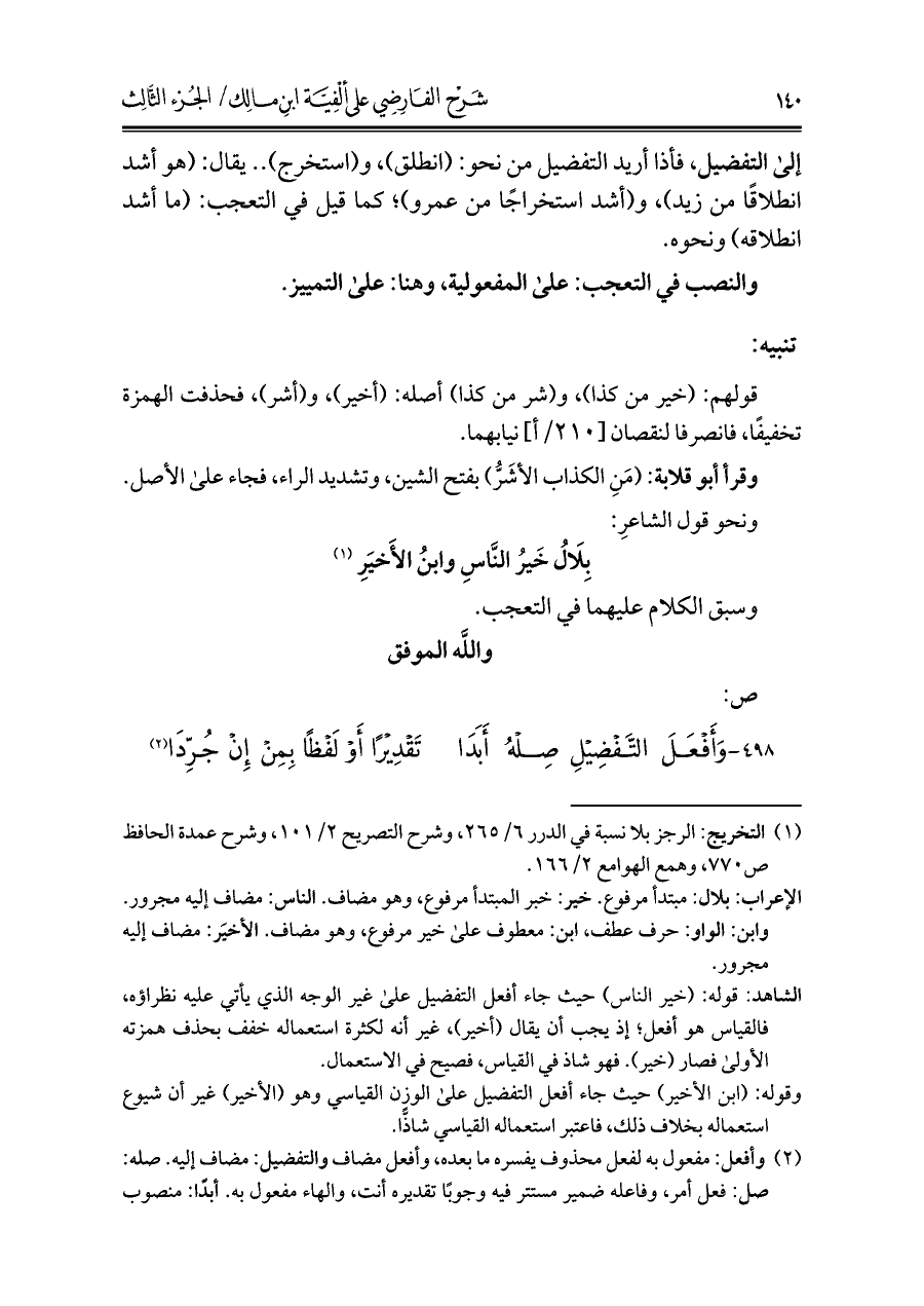 الشاهد: قوله: (خير الناس) حيث جاء أفعل التفضيل على غير الوجه الذي يأتي عليه نظراؤه، فالقياس هو أفعل؛ إذ يجب أن يقال (أخير)، غير أنه لكثرة استعماله خفف بحذف همزته الأولى فصار (خير). فهو شاذ في القياس، فصيح في الاستعمال.