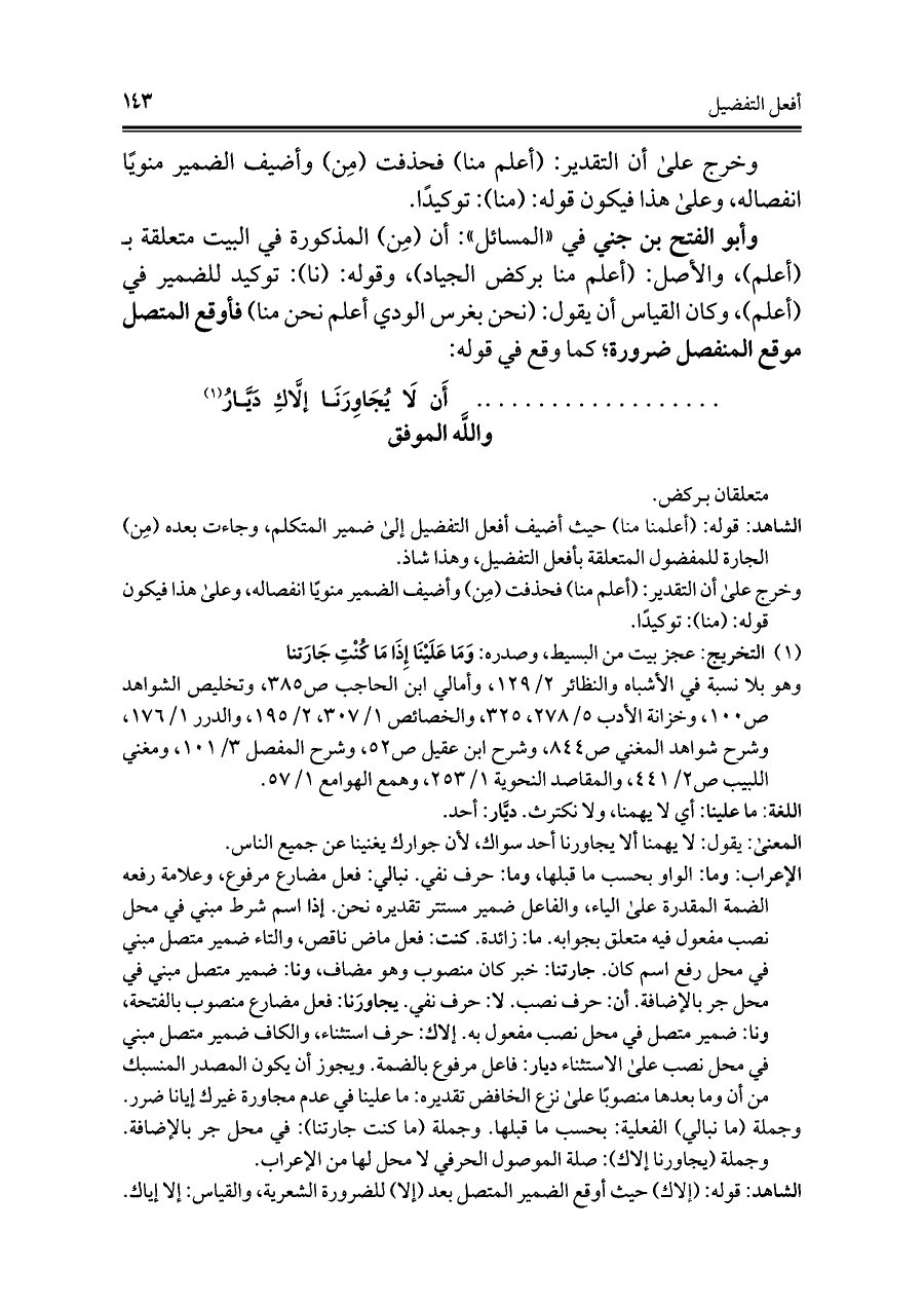 وأبو الفتح بن جني في "المسائل": أن (مِن) المذكورة في البيت متعلقة بـ (أعلم)، والأصل: (أعلم منا بركض الجياد)، وقوله: (نا): توكيد للضمير في (أعلم)، وكان القياس أن يقول: (نحن بغرس الودي أعلم نحن منا) فأوقع المتصل موقع المنفصل ضرورة؛ كما وقع في قوله: