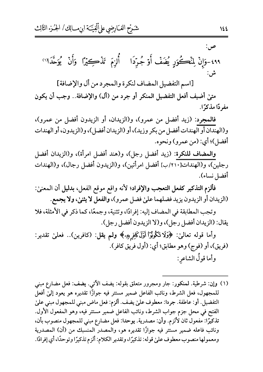 (¬١) وإن: شرطية. لمنكور: جار ومجرور متعلق بقوله: يضف الآتي. يضف: فعل مضارع مبني للمجهول، فعل الشرط، ونائب الفاعل ضمير مستتر فيه جوازًا تقديره هو يعود إلى أفعل التفضيل. أو: عاطفة. جردا: معطوف على يضف. ألزم: فعل ماض مبني للمجهول مبني على الفتح في محل جزم جواب الشرط، ونائب الفاعل ضمير مستتر فيه، وهو المفعول الأول. تذكيرًا: مفعول ثان لألزم. وأن: مصدرية. يوحدا: فعل مضارع مبني للمجهول منصوب بأن، ونائب فاعله ضمير مستتر فيه جوازًا تقديره هو، والمصدر المنسبك من (أن) المصدرية ومعمولها منصوب معطوف على قوله: تذكيرًا، وتقدير الكلام: ألزم تذكيرًا وتوحدًا، أي إفرادًا.