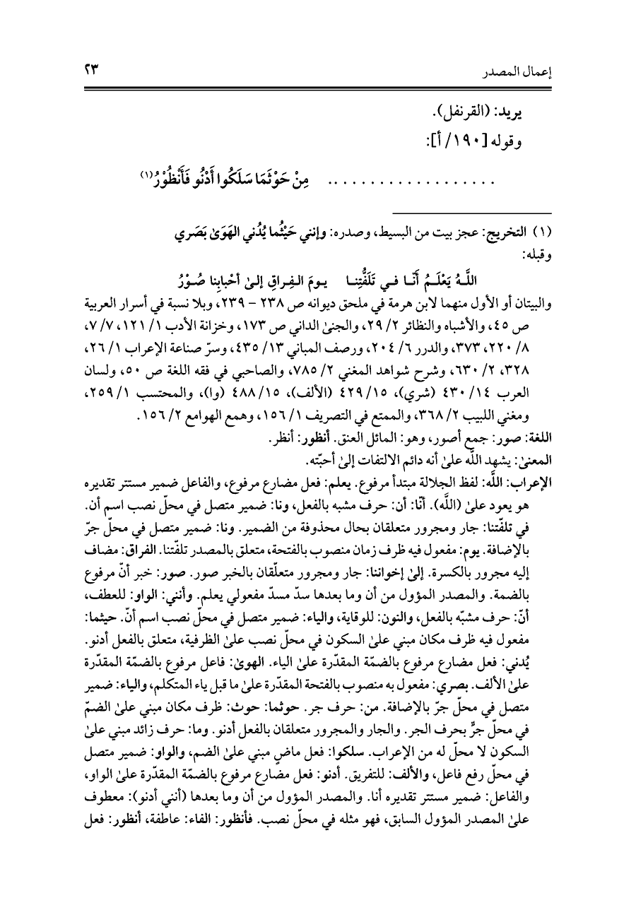 الإعراب: اللَّه: لفظ الجلالة مبتدأ مرفوع. يعلم: فعل مضارع مرفوع، والفاعل ضمير مستتر تقديره هو يعود على (اللَّه). أنّا: أن: حرف مشبه بالفعل، ونا: ضمير متصل في محلّ نصب اسم أن. في تلفّتنا: جار ومجرور متعلقان بحال محذوفة من الضمير. ونا: ضمير متصل في محلّ جرّ بالإضافة. يوم: مفعول فيه ظرف زمان منصوب بالفتحة، متعلق بالمصدر تلفّتنا. الفراق: مضاف إليه مجرور بالكسرة. إلى إخواننا: جار ومجرور متعلّقان بالخبر صور. صور: خبر أنّ مرفوع بالضمة. والمصدر المؤول من أن وما بعدها سدّ مسدّ مفعولي يعلم. وأنني: الواو: للعطف، أنّ: حرف مشبّه بالفعل، والنون: للوقاية، والياء: ضمير متصل في محلّ نصب اسم أنّ. حيثما: مفعول فيه ظرف مكان مبني على السكون في محلّ نصب على الظرفية، متعلق بالفعل أدنو. يُدني: فعل مضارع مرفوع بالضمّة المقدّرة على الياء. الهوى: فاعل مرفوع بالضمّة المقدّرة على الألف. بصري: مفعول به منصوب بالفتحة المقدّرة على ما قبل ياء المتكلم، والياء: ضمير متصل في محلّ جرّ بالإضافة. من: حرف جر. حوثما: حوث: ظرف مكان مبني على الضمّ في محلّ جرٍّ بحرف الجر. والجار والمجرور متعلقان بالفعل أدنو. وما: حرف زائد مبني على السكون لا محلّ له من الإعراب. سلكوا: فعل ماضٍ مبني على الضم، والواو: ضمير متصل في محلّ رفع فاعل، والألف: للتفريق. أدنو: فعل مضارع مرفوع بالضمّة المقدّرة على الواو، والفاعل: ضمير مستتر تقديره أنا. والمصدر المؤول من أن وما بعدها (أنني أدنو): معطوف على المصدر المؤول السابق، فهو مثله في محلّ نصب. فأنظور: الفاء: عاطفة، أنظور: فعل =
