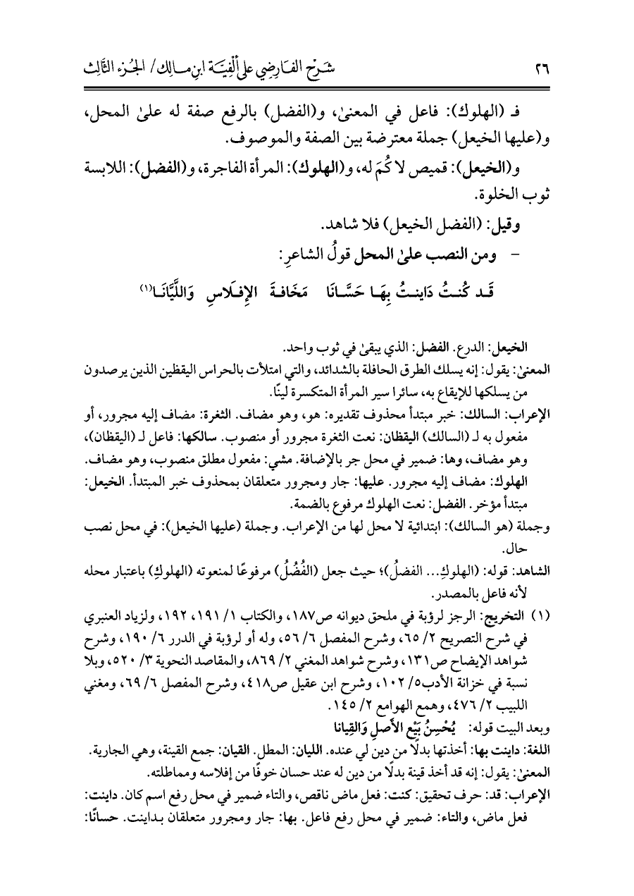 الشاهد: قوله: (الهلوكِ. . . الفضلُ)؛ حيث جعل (الفُضُلُ) مرفوعًا لمنعوته (الهلوكِ) باعتبار محله لأنه فاعل بالمصدر.