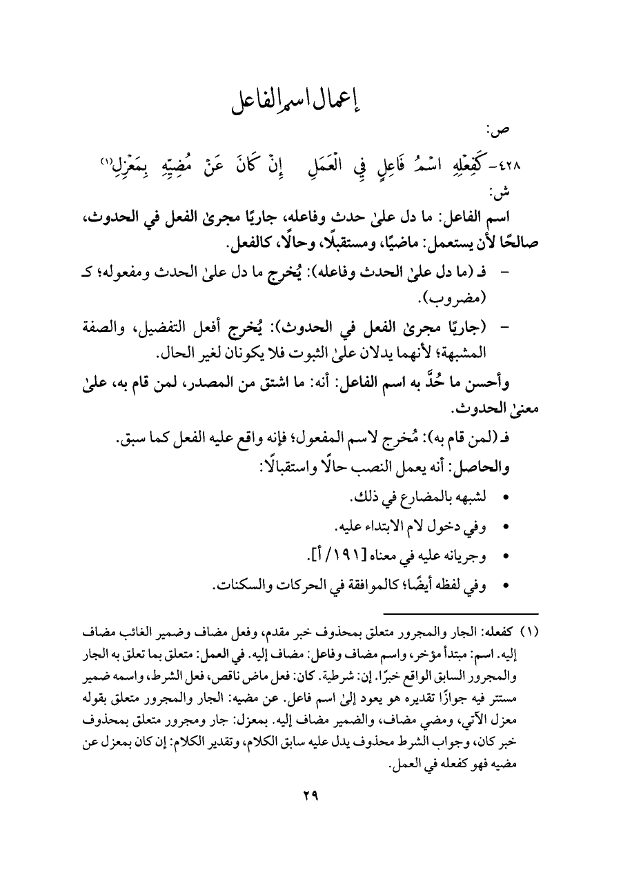 (¬١) كفعله: الجار والمجرور متعلق بمحذوف خبر مقدم، وفعل مضاف وضمير الغائب مضاف إليه. اسم: مبتدأ مؤخر، واسم مضاف وفاعل: مضاف إليه. في العمل: متعلق بما تعلق به الجار والمجرور السابق الواقع خبرًا. إلى: شرطية. كان: فعل ماض ناقص، فعل الشرط، واسمه ضمير مستتر فيه جوازًا تقديره هو يعود إلى اسم فاعل. عن مضيه: الجار والمجرور متعلق بقوله معزل الآتي، ومضي مضاف، والضمير مضاف إليه. بمعزل: جار ومجرور متعلق بمحذوف خبر كان، وجواب الشرط محذوف يدل عليه سابق الكلام، وتقدير الكلام: إن كان بمعزل عن مضيه فهو كفعله في العمل.