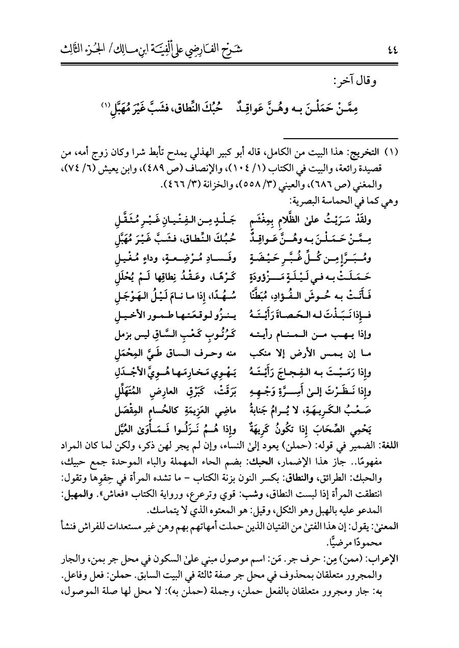 الإعراب: (ممن) مِن: حرف جر. مَن: اسم موصول مبني على السكون في محل جر بمن، والجار والمجرور متعلقان بمحذوف في محل جر صفة ثالثة في البيت السابق. حملن: فعل وفاعل. به: جار ومجرور متعلقان بالفعل حملن، وجملة (حملن به): لا محل لها صلة الموصول، =