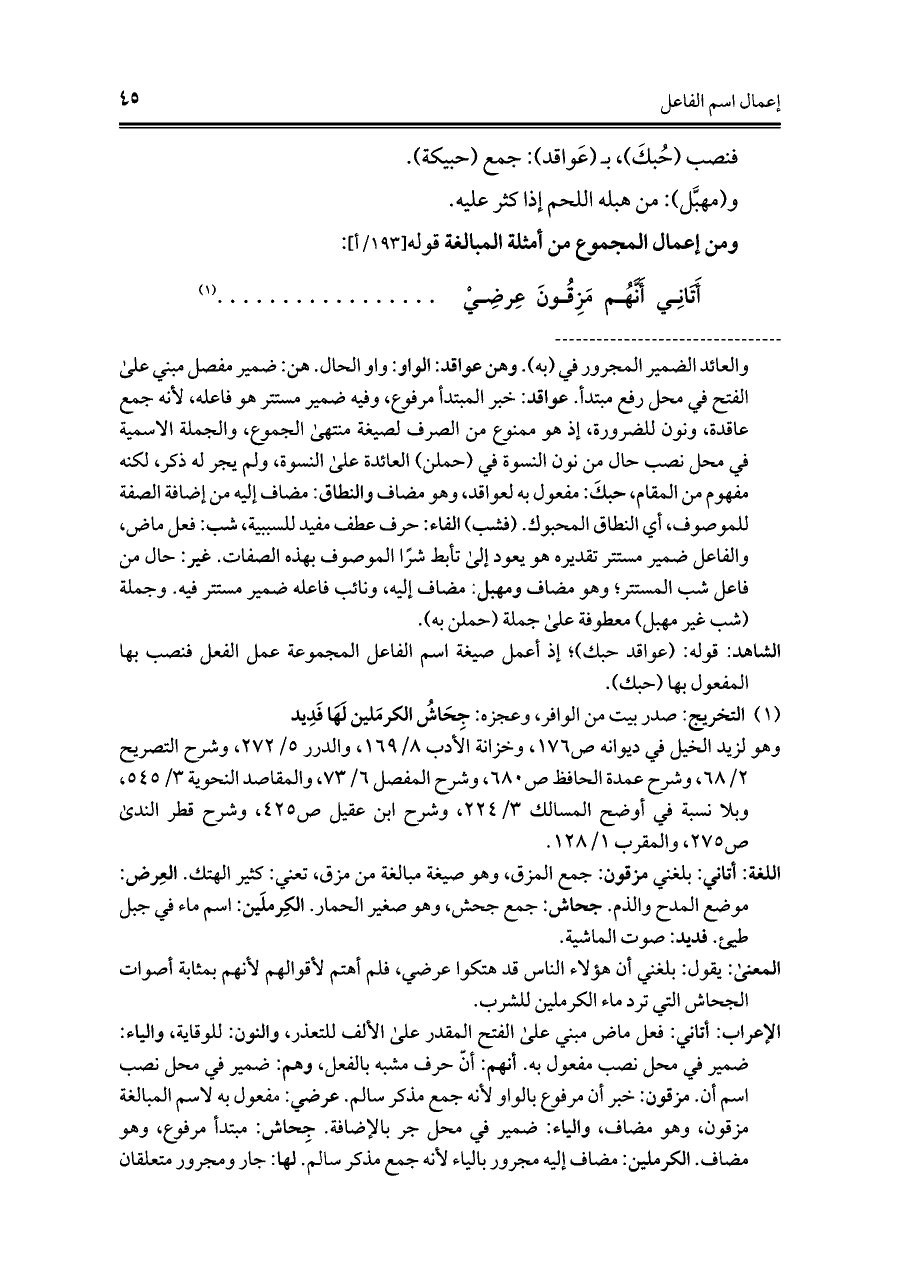 الشاهد: قوله: (عواقد حبك)؛ إذ أعمل صيغة اسم الفاعل المجموعة عمل الفعل فنصب بها المفعول بها (حبك).