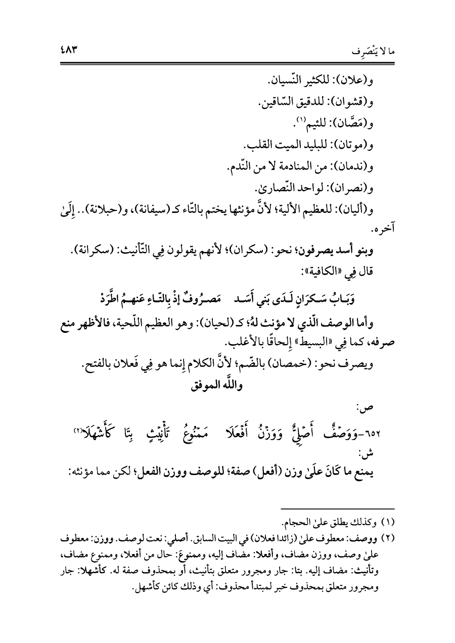 ٦٥٢ - وَوَصفُ أَصلِيُّ وَوَزنُ أَفعَلَا ... ممنُوعُ تَأنِيثٍ بِتَا كَأَشهَلَا (¬٢)