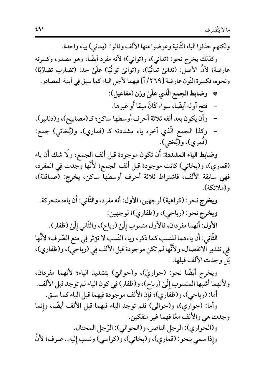 وضابط الياء المشددة: أَن تكون موجودة قبل ألف الجمع، ولَا شك أَن ياء (قماوي)، و (بخاتي) كانت موجودة قبل ألف الجمع؛ لأَنَّها وجدت فِي المفرد، فهي سابقة الألف، فاشتراط ثلاثة أحرف أوسطها ساكن، يخرج: (صياقلة)، و (ملائكة).