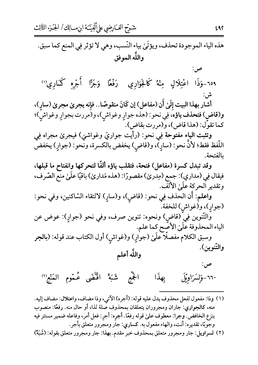 وتثبت الياء مفتوحة فِي نحو: (رأيت جواريَ وغواشيَ) فيجرى مجراه فِي اللّفظ فقط؛ لأنَّ نحو: (سارٍ)، و (قاضٍ) يخفض بالكسرة، ونحو: (جوارٍ) يخفض بالفتحة.