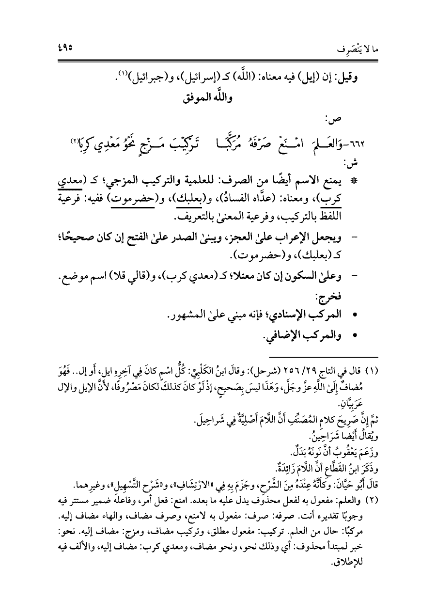 ٦٦٢ - وَالعَلَم امنَع صَرفَهُ مُرَكَّبَا ... تركيبَ مَزجٍ نَحو مَعديِ كرِبَا (¬٢)