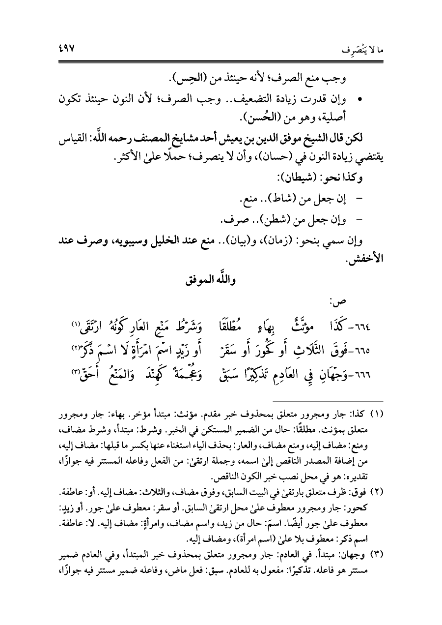 ٦٦٦ - وَجهَانِ فيِ العَادِمِ تَذكِيرًا سَبَق ... وَعجُمَةً كَهِندَ وَالمَنعُ أَحَقّ (¬٣)