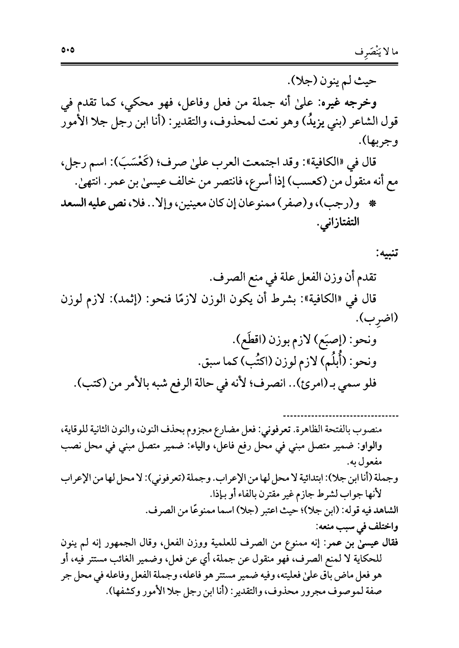 فقال عيسى بن عمر: إنه ممنوع من الصرف للعلمية ووزن الفعل، وقال الجمهور إنه لم ينون للحكاية لا لمنع الصرف، فهو منقول عن جملة، أي عن فعل، وضمير الغائب مستتر فيه، أو هو فعل ماض باق علي فعليته، وفيه ضمير مستتر هو فاعله، وجملة الفعل وفاعله في محل جر صفة لموصوف مجرور محذوف، والتقدير: (أنا ابن رجل جلا الأمور وكشفها).