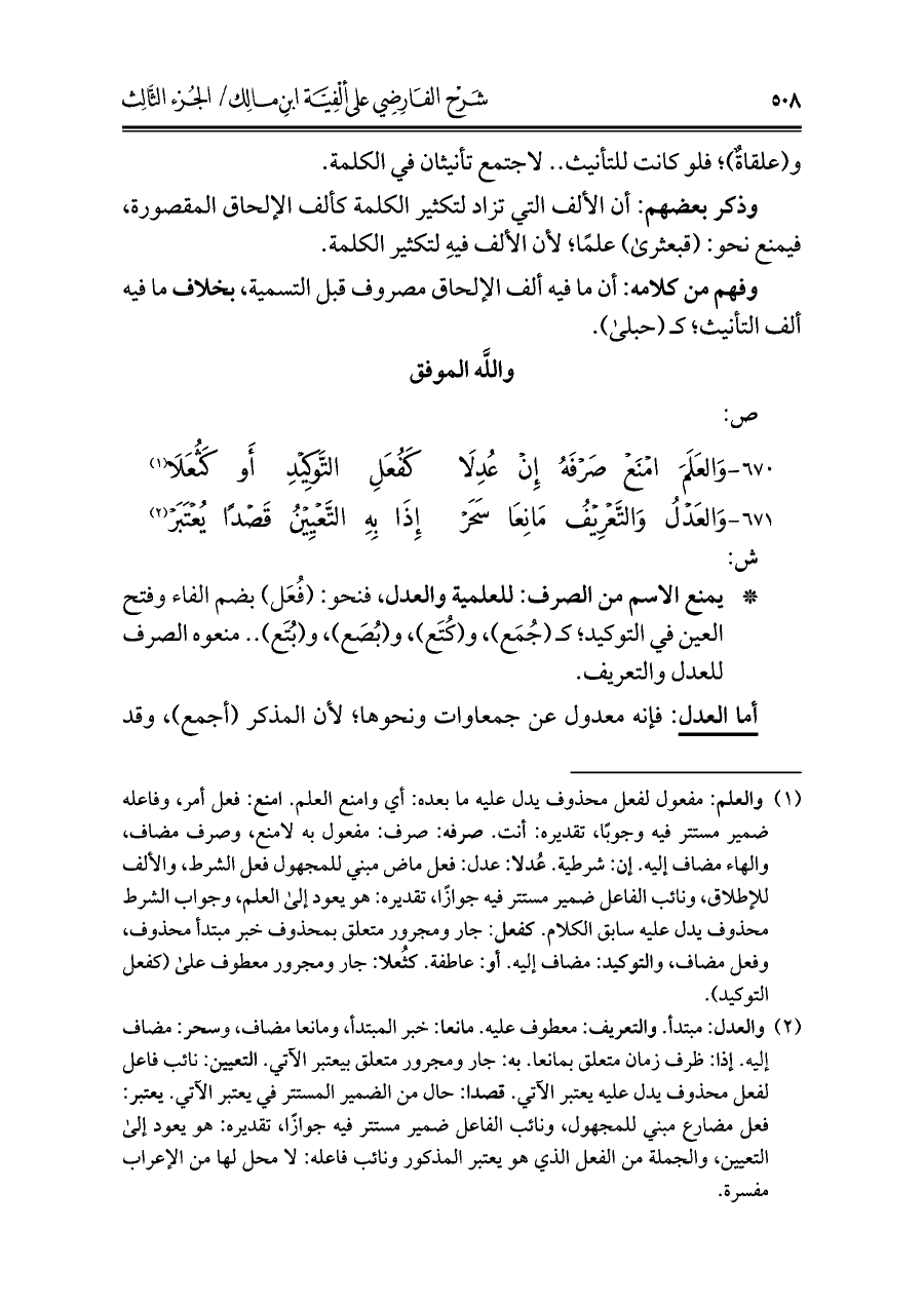 (¬١) والعلم: مفعول لفعل محذوف يدل عليه ما بعده: أي وامنع العلم. امنع: فعل أمر، وفاعله ضمير مستتر فيه وجوبًا، تقديره: أنت. صرفه: صرف: مفعول به لامنع، وصرف مضاف، والهاء مضاف إليه. إن: شرطية. عُدلا: عدل: فعل ماض مبني للمجهول فعل الشرط، والألف للإطلاق، ونائب الفاعل ضمير مستتر فيه جوازًا، تقديره: هو يعود إلي العلم، وجواب الشرط محذوف يدل عليه سابق الكلام. كفعل: جار ومجرور متعلق بمحذوف خبر مبتدأ محذوف، وفعل مضاف، والتوكيد: مضاف إليه. أو: عاطفة. كثُعلا: جار ومجروو معطوف علي (كفعل التوكيد).