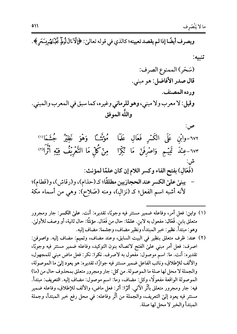 ٦٧٣ - عِندَ تَمِيمِ وَاصرِفَن مَا نُكِّرَا ... مِن كُلِّ مَا التَّعرِيفُ فِيهِ أثَرَا (¬٢)