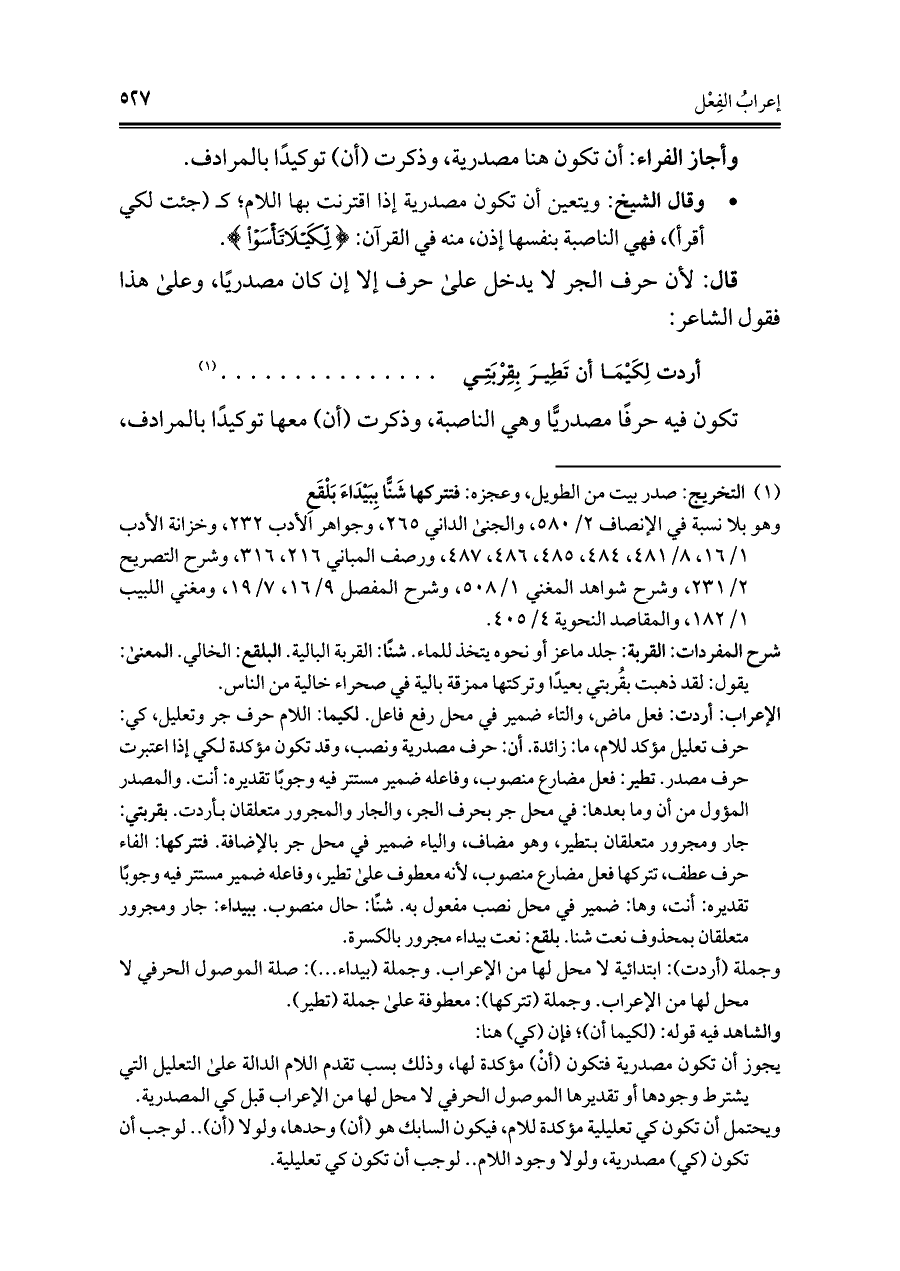 الإعراب، أردت: فعل ماض، والتاء ضمير في محل رفع فاعل. لكيما: اللام حرف جر وتعليل، كي: حرف تعليل مؤكد للام، ما: زائدة. أن: حرف مصدرية ونصب، وقد تكون مؤكدة لكي إذا اعتبرت حرف مصدر. تطير: فعل مضارع منصوب، وفاعله ضمير مستتر فيه وجوبًا تقديره: أنت. والمصدر المؤول من أن وما بعدها: في محل جر بحرف الجر، والجار والمجرور متعلقان بأردت. بقربتي: جار ومجرور متعلقان بتطير، وهو مضاف، والياء ضمير في محل جر بالإضافة. فتتركها: الفاء حرف عطف، تتركها فعل مضارع منصوب، لأنه معطوف على تطير، وفاعله ضمير مستتر فيه وجوبًا تقديره: أنت، وها: ضمير في محل نصب مفعول به. شنًا: حال منصوب. ببيداء: جار ومجرور متعلقان بمحذوف نعت شنا. بلقع: نعت بيداء مجرور بالكسرة.