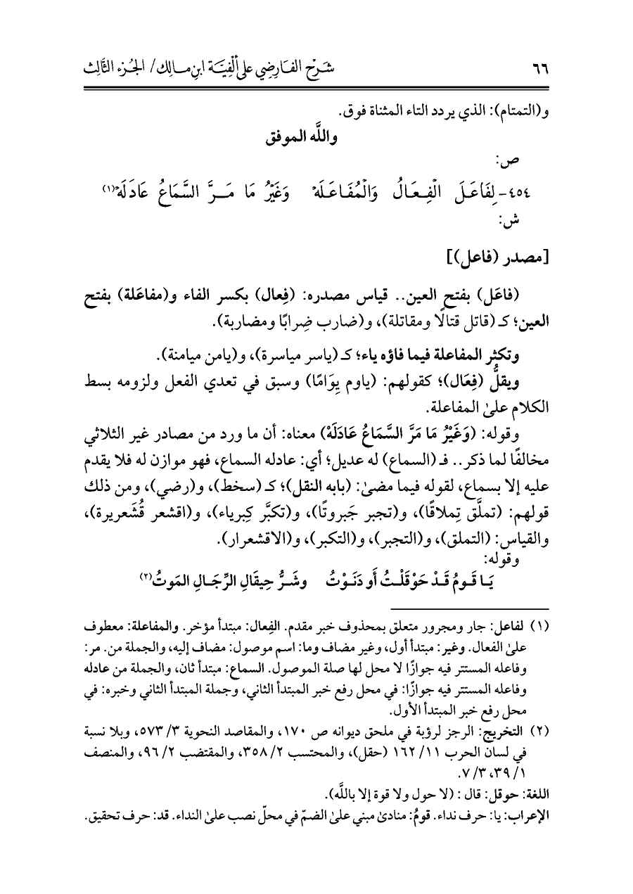 (¬١) لفاعل: جار ومجرور متعلق بمحذوف خبر مقدم. الفِعال: مبتدأ مؤخر. والمفاعلة: معطوف على الفعال. وغير: مبتدأ أول، وغير مضاف وما: اسم موصول: مضاف إليه، والجملة من. مر: وفاعله المستتر فيه جوازًا لا محل لها صلة الموصول. السماع: مبتدأ ثان، والجملة من عادله وفاعله المستتر فيه جوازًا: في محل رفع خبر المبتدأ الثاني، وجملة المبتدأ الثاني وخبره: في محل رفع خبر المبتدأ الأول.