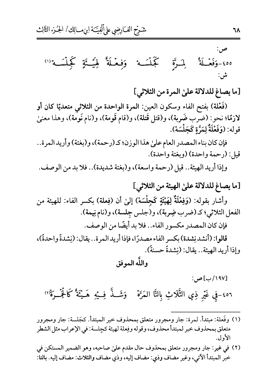 (¬١) وفَعلة: مبتدأ. لمرة: جار ومجرور متعلق بمحذوف خبر المبتدأ. كجَلسة: جار ومجرور متعلق بمحذوف خبر لمبتدأ محذوف، وقوله وفِعلة لهيئة كجِلسة: في الإعراب مثل الشطر الأول.