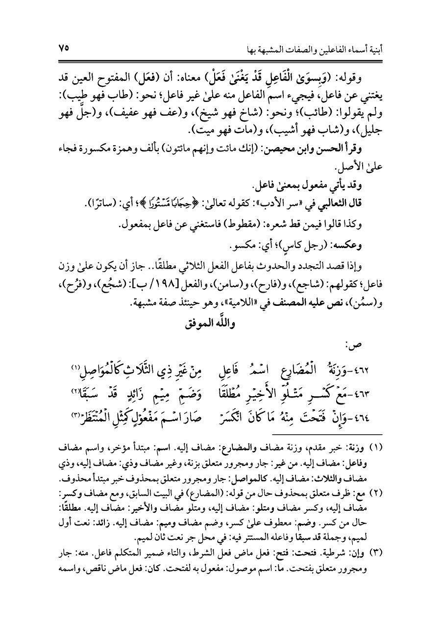 وإذا قصد التجدد والحدوث بفاعل الفعل الثلاثي مطلقًا. . جاز أن يكون على وزن فاعل؛ كقولهم: (شاجع)، و (فارح)، و (سامن)، والفعل: (شجُع)، و (فرُح)، و (سمُن)، نص عليه المصنف في "اللامية"، وهو حينئذ صفة مشبهة.