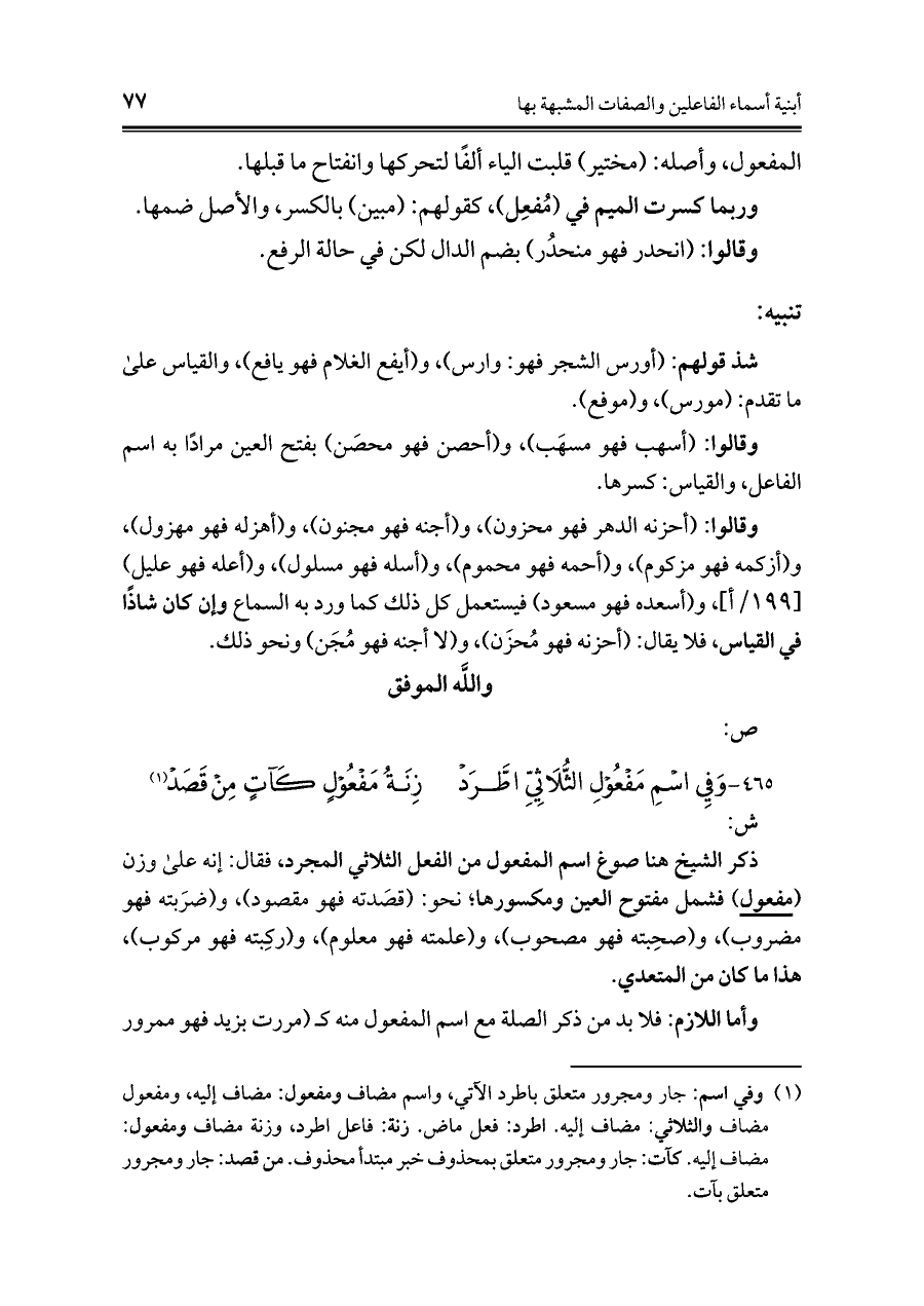 ذكر الشيخ هنا صوغ اسم المفعول من الفعل الثلاثي المجرد, فقال: إنه على وزن (مفعول) فشمل مفتوح العين ومكسورها؛ نحو: (قصَدته فهو مقصود)، و (ضرَبته فهو مضروب)، و (صحِبته فهو مصحوب)، و (علمته فهو معلوم)، و (ركِبته فهو مركوب)، هذا ما كان من المتعدي.