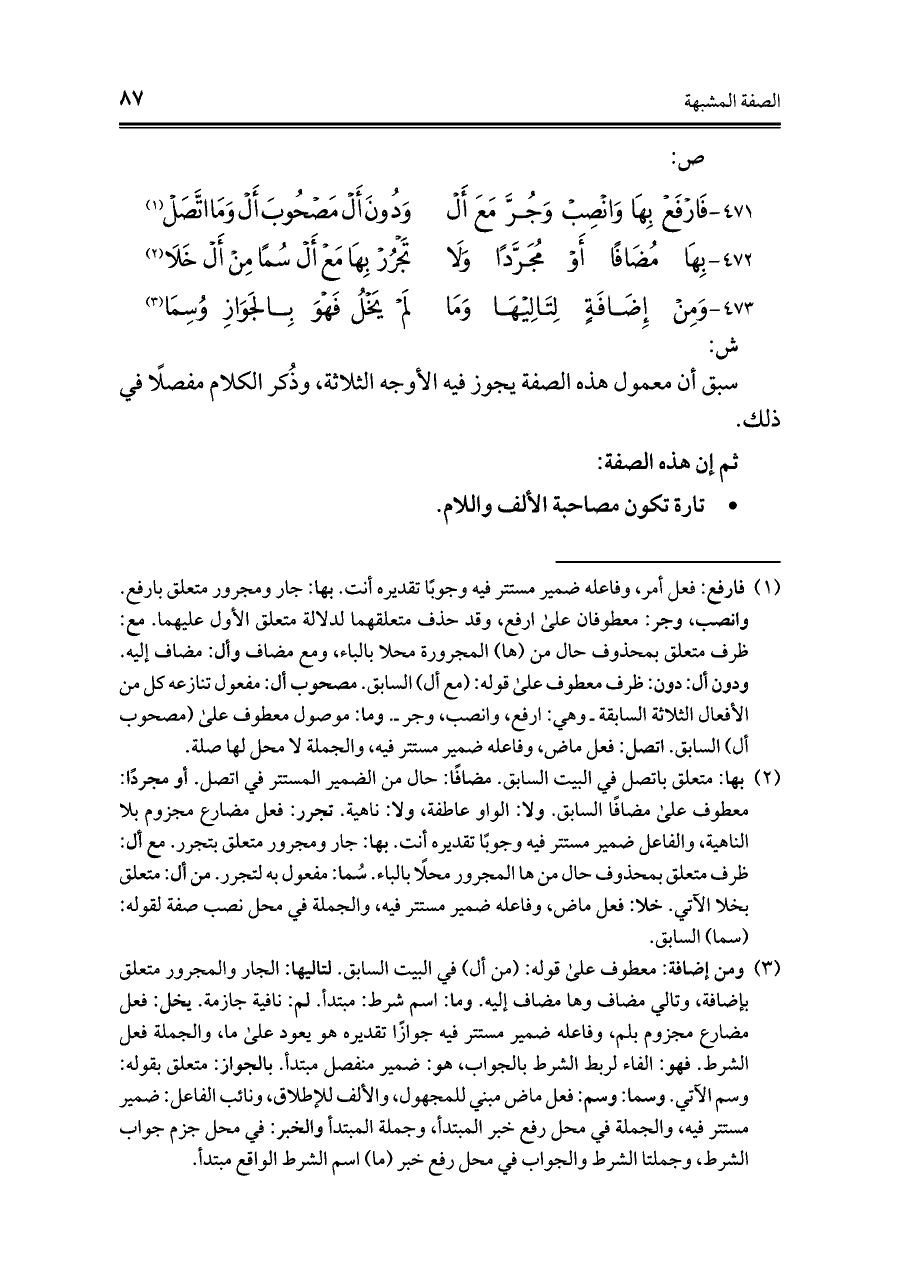 (¬١) فارفع: فعل أمر، وفاعله ضمير مستتر فيه وجوبًا تقديره أنت. يها: جار ومجرور متعلق بارفع. وانصب, وجر: معطوفان على ارفع، وقد حذف متعلقهما لدلالة متعلق الأول عليهما. مع: ظرف متعلق بمحذوف حال من (ها) المجرورة محلا بالباء، ومع مضاف وأل: مضاف إليه. ودون أل: دون: ظرف معطوف على قوله: (مع أل) السابق. مصحوب أل: مفعول تنازعه كل من الأفعال الثلاثة السابقة -وهي: ارفع، وانصب، وجر-. وما: موصول معطوف على (مصحوب أل) السابق. اتصل: فعل ماض، وفاعله ضمير مستتر فيه، والجملة لا محل لها صلة.