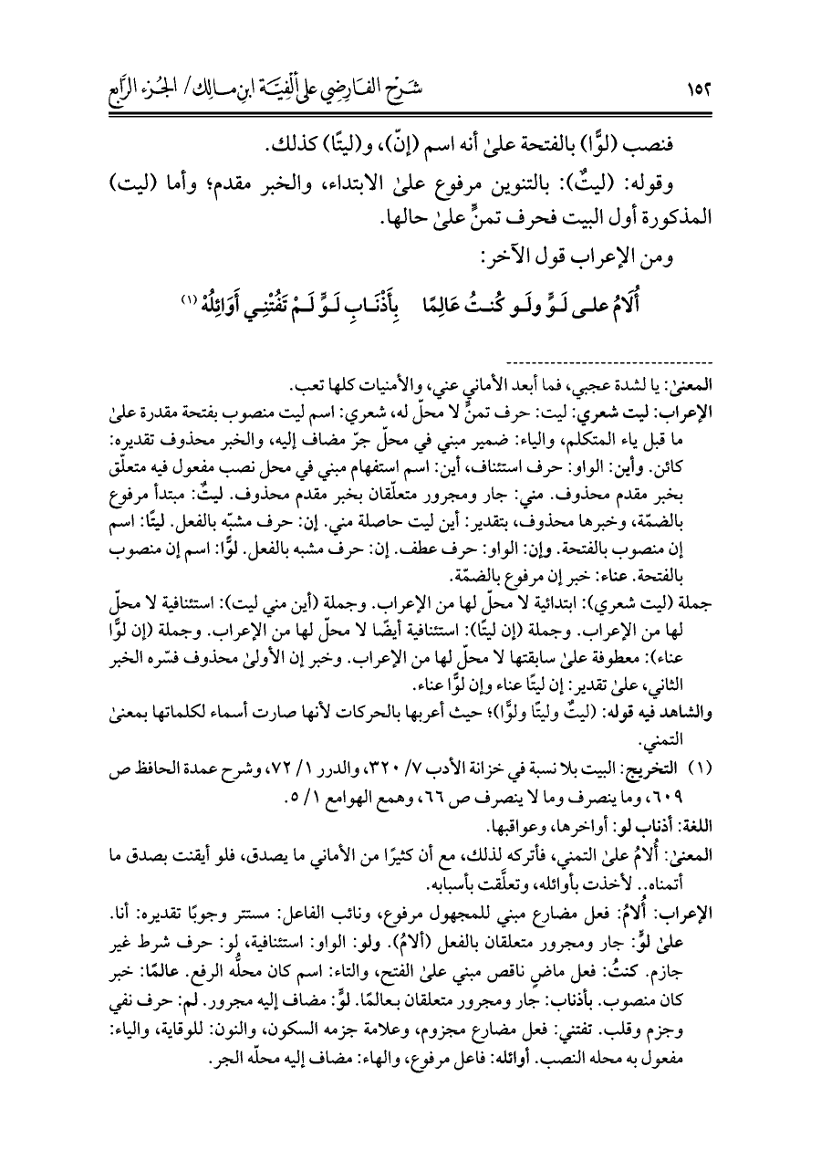 الإعراب: ليت شعري: ليت: حرف تمنٍّ لا محلّ له، شعري: اسم ليت منصوب بفتحة مقدرة على ما قبل ياء المتكلم، والياء: ضمير مبني في محلّ جر مضاف إليه، والخبر محذوف تقديره: كائن. وأين: الواو: حرف استئناف، أين: اسم استفهام مبني في محل نصب مفعول فيه متعلّق بخبر مقدم محذوف. منى: جار ومجرور متعلّقان بخبر مقدم محذوف. ليتٌ: مبتدأ مرفوع بالضمّة، وخبرها محذوف، بتقدير: أين ليت حاصلة مني. إن: حرف مشبّه بالفعل. ليتًا: اسم إن منصوب بالفتحة. وإن: الواو: حرف عطف. إن: حرف مشبه بالفعل. لوًّا: اسم إن منصوب بالفتحة. عناء: خبر إن مرفوع بالضمّة.
