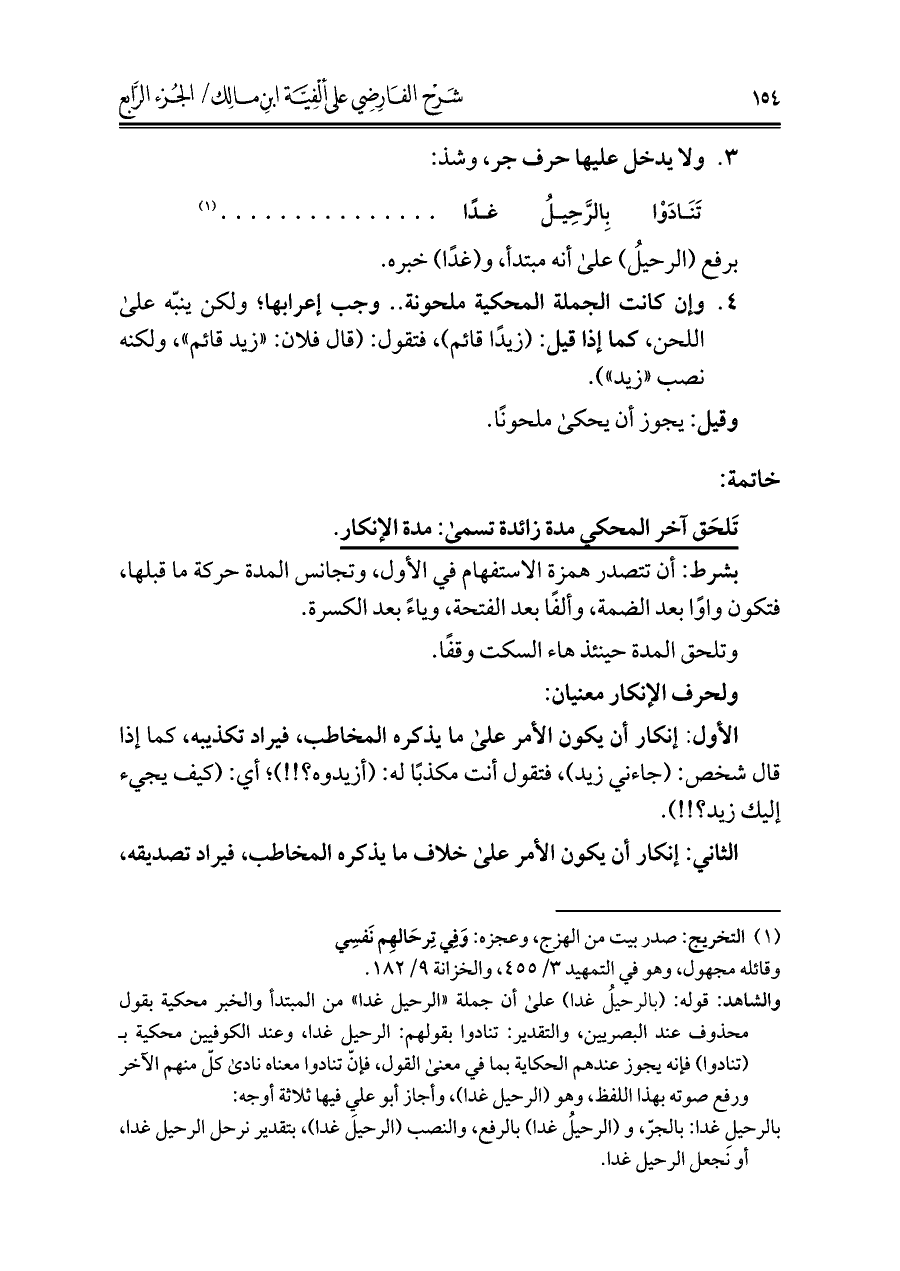 والشاهد: قوله: (بالرحيلُ غدا) على أن جملة "الرحيل غدا" من المبتدأ والخبر محكية بقول محذوف عند البصريين، والتقدير: تنادوا بقولهم: الرحيل غدا، وعند الكوفيين محكية بـ (تنادوا) فإنه يجوز عندهم الحكاية بما في معنى القول، فإنّ تنادوا معناه نادى كلّ منهم الآخر ورفع صوته بهذا اللفظ، وهو (الرحيل غدا)، وأجاز أبو علي فيها ثلاثة أوجه: