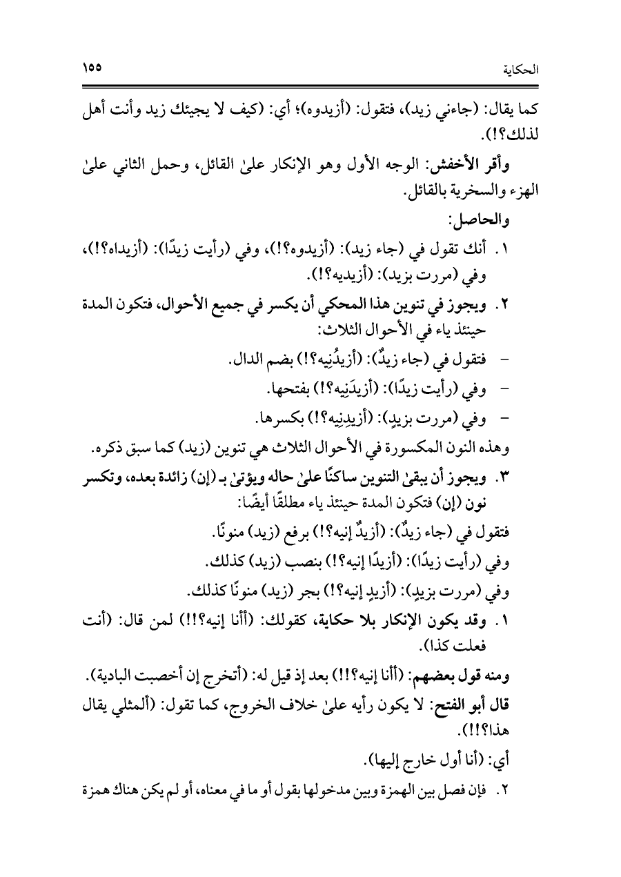 ١. أنك تقول في (جاء زيد): (أزيدوه؟!)، وفي (رأيت زيدًا): (أزيداه؟!)، وفي (مررت بزيد): (أزيديه؟!).