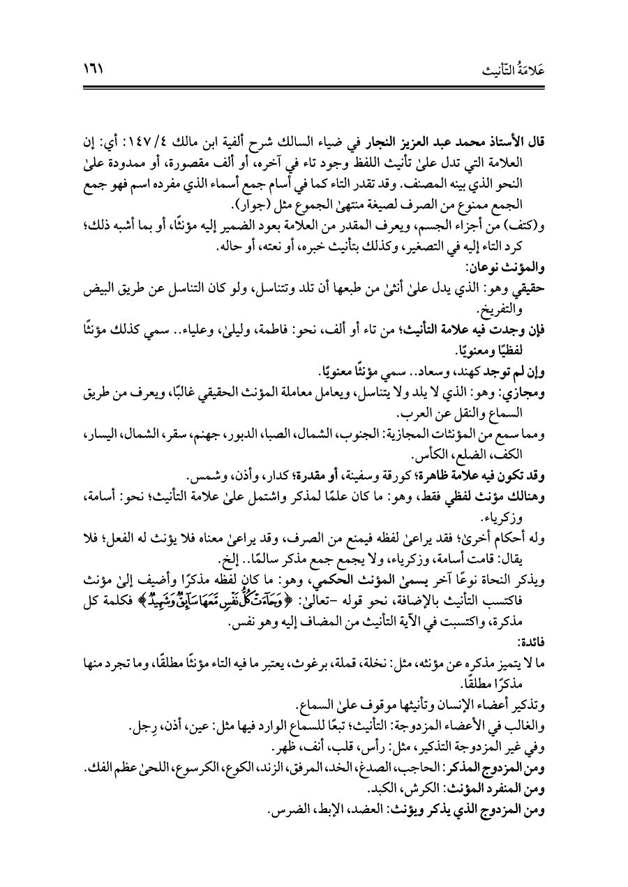 = قال الأستاذ محمد عبد العزيز النجار في ضياء السالك شرح ألفية ابن مالك ٤/ ١٤٧: أي: إن العلامة التي تدل على تأنيث اللفظ وجود تاء في آخره، أو ألف مقصورة، أو ممدودة على النحو الذي بينه المصنف. وقد تقدر التاء كما في أسام جمع أسماء الذي مفرده اسم فهو جمع الجمع ممنوع من الصرف لصيغة منتهى الجموع مثل (جوار).