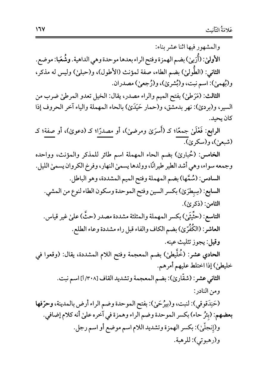 الثاني: (الطُّولى) بضم الطاء، صفة لمؤنث (الأطول)، و (حبلى) وليس له مذكر، و (بُهمى): اسم نبت، و (بُشرى)، و (رُجعى) مصدران.
