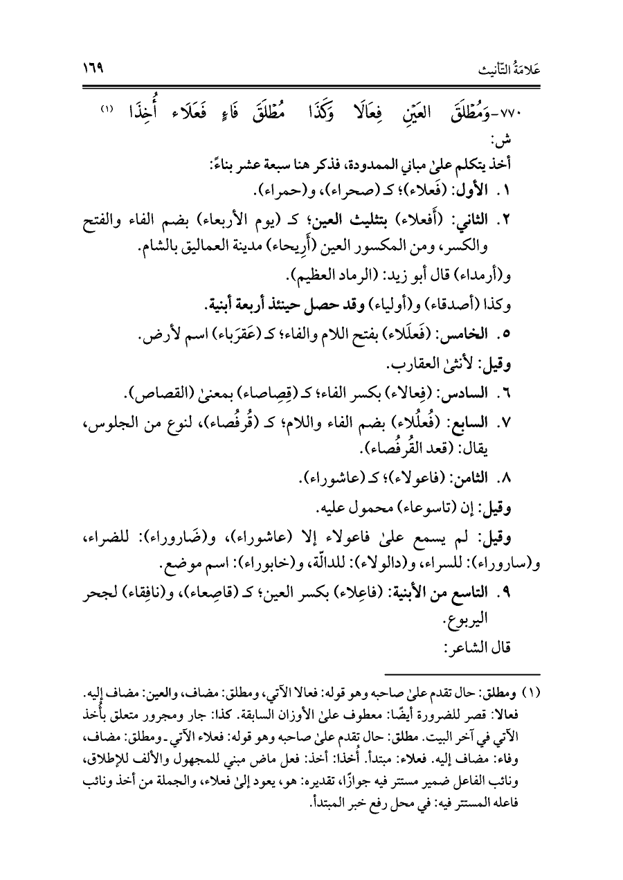 (¬١) ومطلق: حال تقدم على صاحبه وهو قوله: فعالا الآتي، ومطلق: مضاف، والعين: مضاف إليه. فعالا: قصر للضرورة أيضًا: معطوف على الأوزان السابقة. كذا: جار ومجرور متعلق بأُخذ الآتي في آخر البيت. مطلق: حال تقدم على صاحبه وهو قوله: فعلاء الآتي - ومطلق: مضاف، وفاء: مضاف إليه. فعلاء: مبتدأ. أُخذا: أخذ: فعل ماض مبني للمجهول والألف للإطلاق، ونائب الفاعل ضمير مستتر فيه جوازًا، تقديره: هو، يعود إلى فعلاء، والجملة من أخذ ونائب فاعله المستتر فيه: في محل رفع خبر المبتدأ.