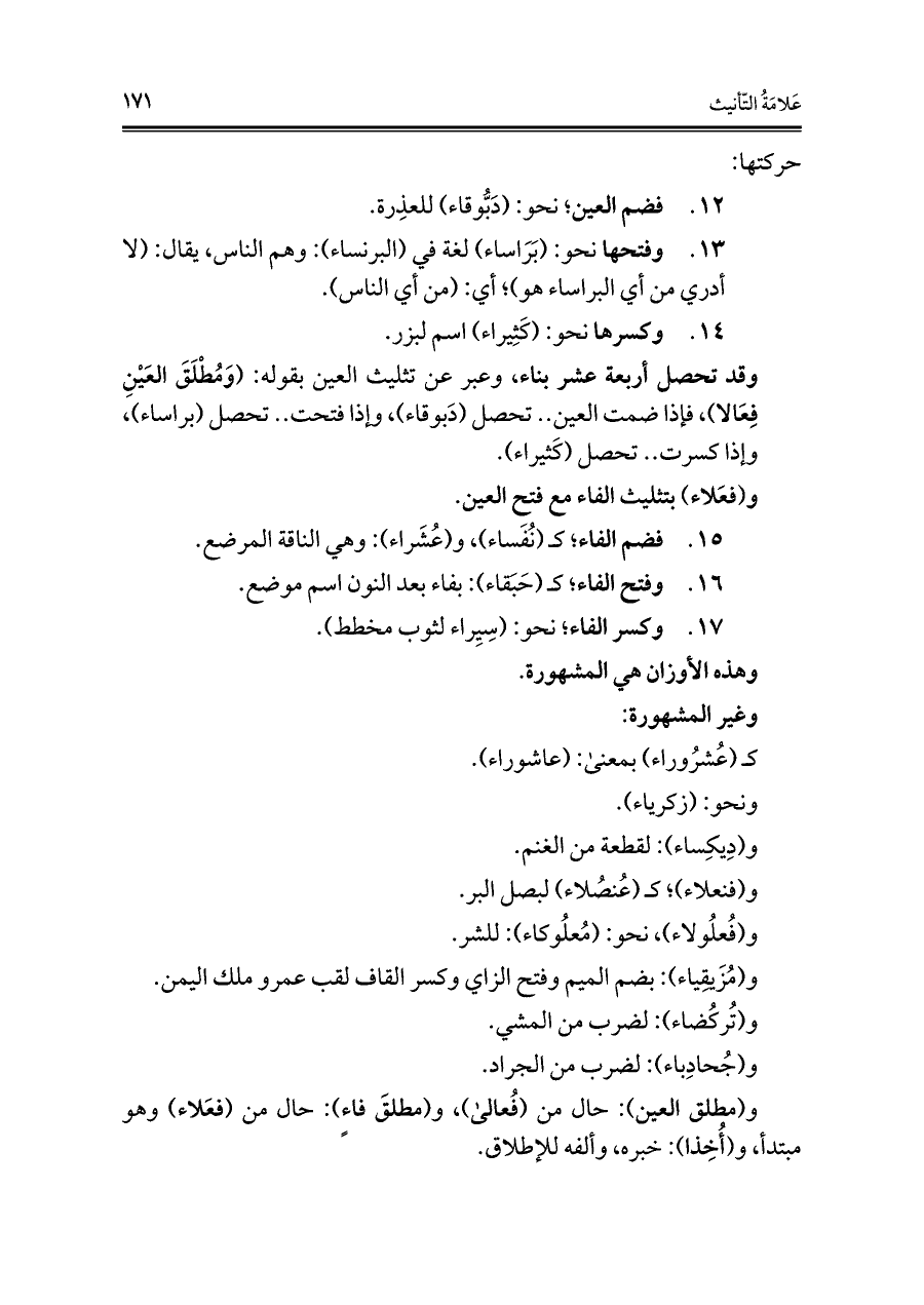 وقد تحصل أربعة عشر بناء، وعبر عن تثليث العين بقوله: (وَمُطْلَقَ العَيْنِ فِعَالا)، فإذا ضمت العين. . تحصل (دَبوقاء)، وإذا فتحت. . تحصل (براساء)، وإذا كسرت. . تحصل (كَثيراء).