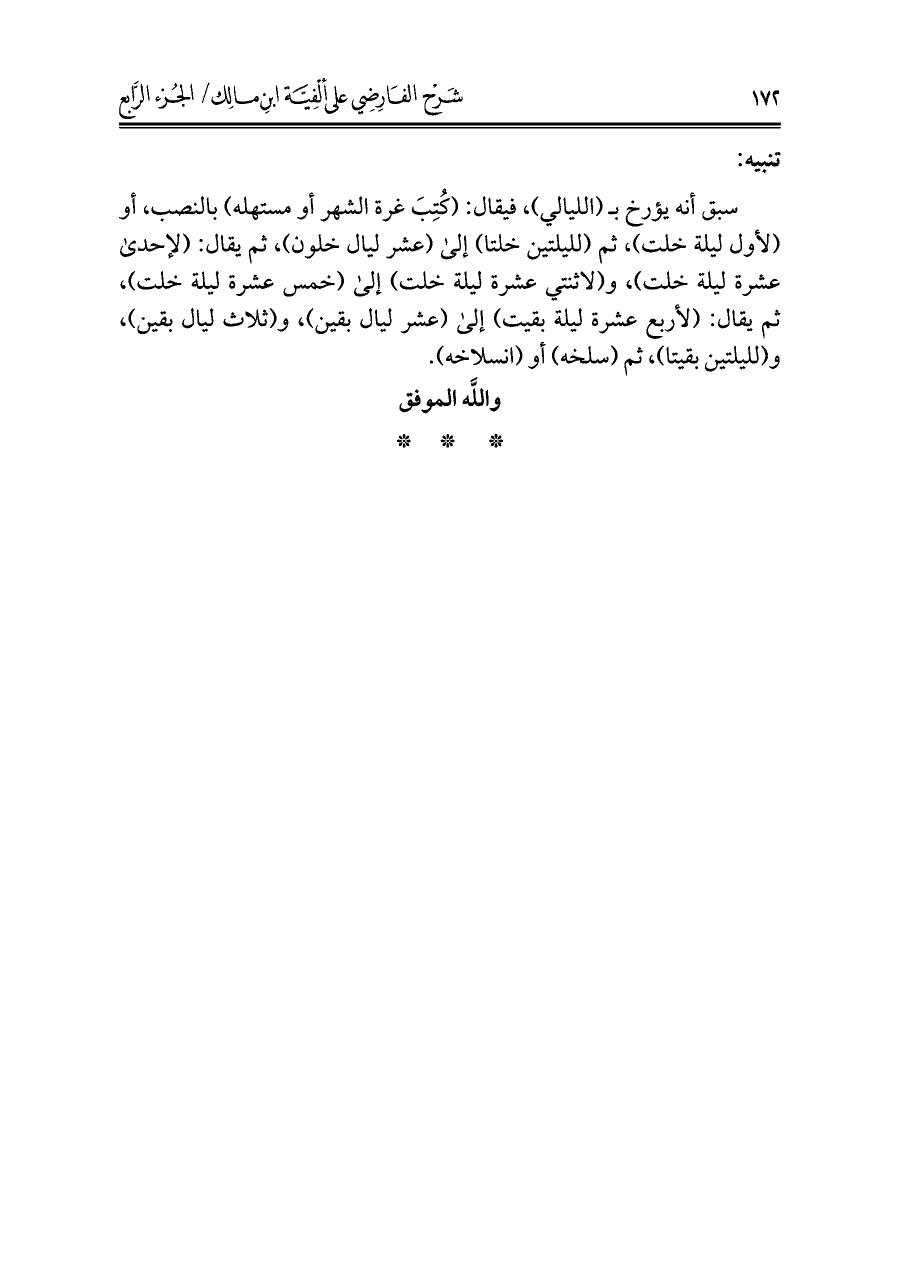 سبق أنه يؤرخ بـ (الليالي)، فيقال: (كُتِبَ غرة الشهر أو مستهله) بالنصب، أو (لأول ليلة خلت)، ثم (لليلتين خلتا) إلى (عشر ليال خلون)، ثم يقال: (لإحدى عشرة ليلة خلت)، و (لاثنتي عشرة ليلة خلت) إلى (خمس عشرة ليلة خلت)، ثم يقال: (لأربع عشرة ليلة بقيت) إلى (عشر ليال بقين)، و (ثلاث ليال بقين)، و (لليلتين بقيتا)، ثم (سلخه) أو (انسلاخه).