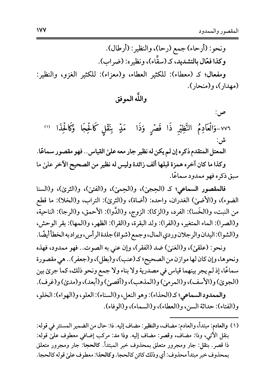 ٧٧٦ - وَالْعَادِمُ النَّظِيْرِ ذَا قَصْرٍ وَذَا ... مَدٍّ بِنَقْلٍ كَالْحِجَا وَكَالْحِذَا (¬١)
