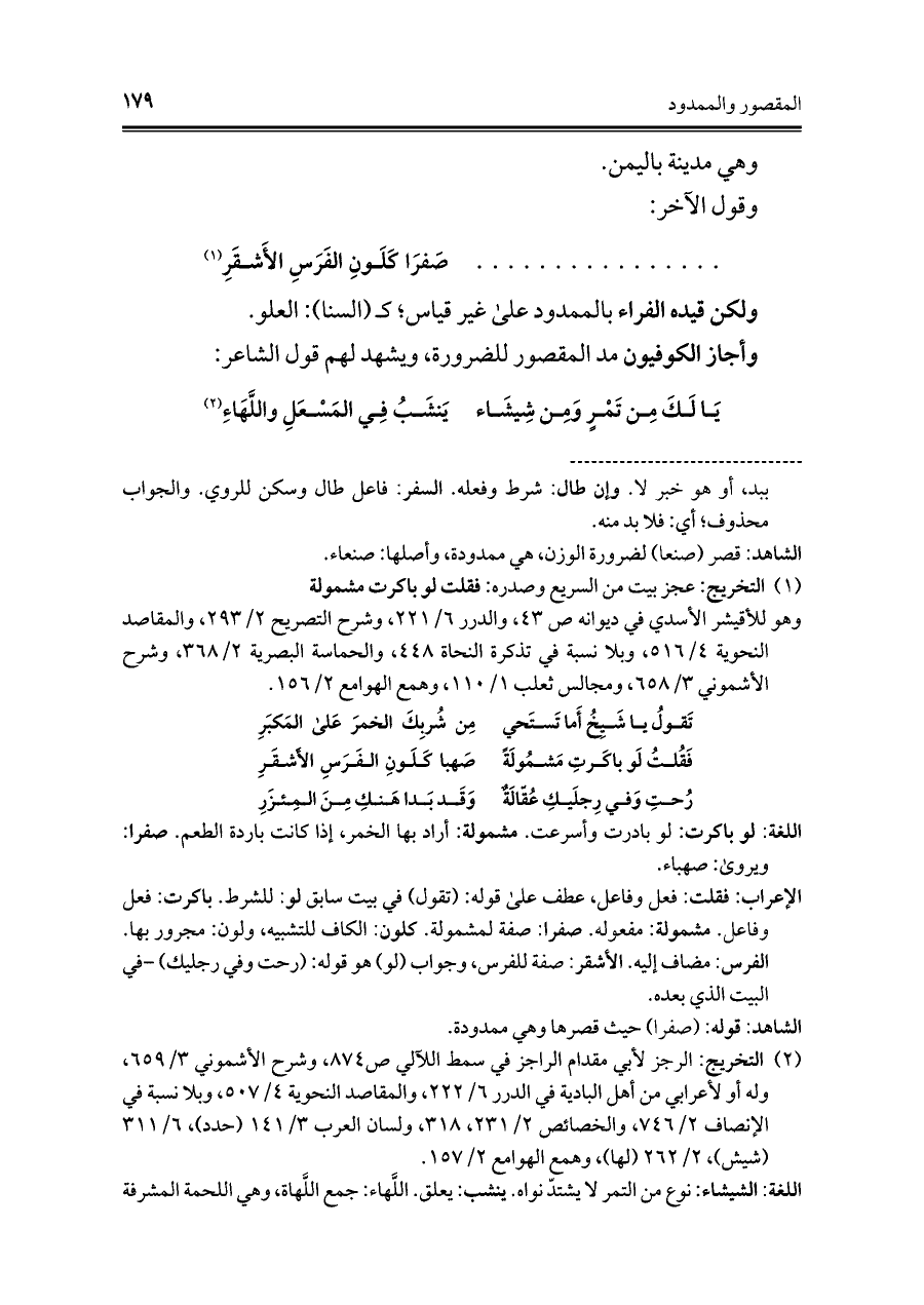 الشاهد: قوله: (صفرا) حيث قصرها وهي ممدودة.