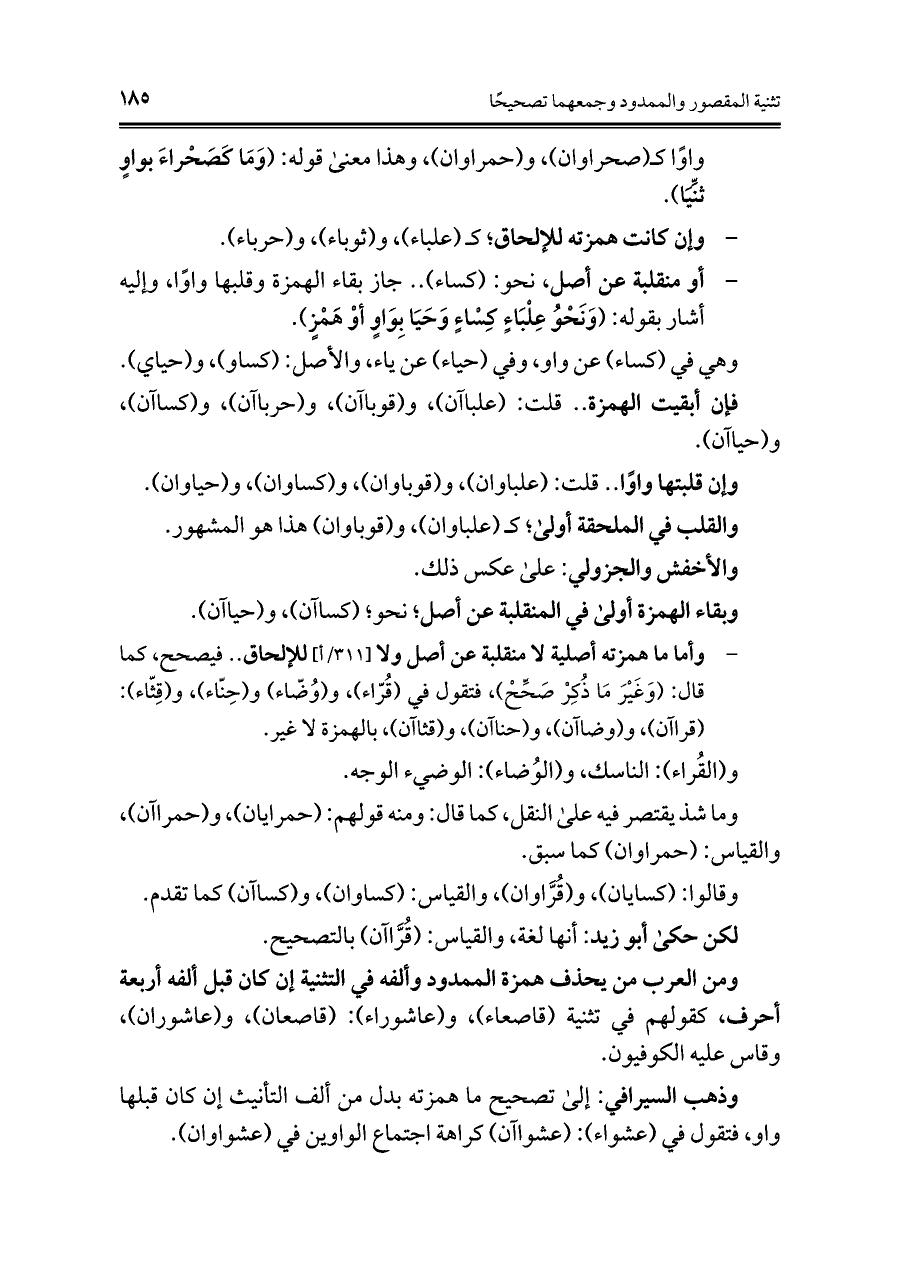 وذهب السيرافي: إلى تصحيح ما همزته بدل من ألف التأنيث إن كان قبلها واو، فتقول في (عشواء): (عشواآن) كراهة اجتماع الواوين في (عشواوان).