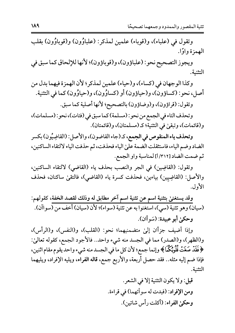 وتقول: (قراؤون)، و (وضاؤون) بالتصحيح؛ لأنها أصلية كما سبق.
