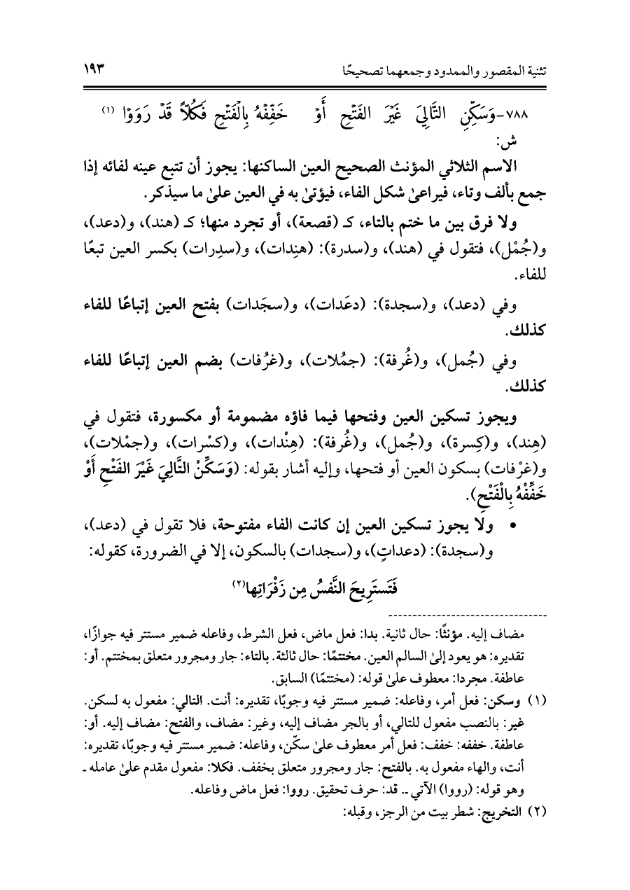 ويجوز تسكين العين وفتحها فيما فاؤه مضمومة أو مكسورة، فتقول في (هِند)، و (كِسوة)، و (جُمل)، و (غُرفة): (هِنْدات)، و (كسْرات)، و (جمْلات)، و (غرْفات) بسكون العين أو فتحها, وإليه أشار بقوله: (وَسَكِّنِ التَّالِيَ غَيْرَ الفَتْحِ أَوْ خَفِّفْهُ بِالْفَتْحِ).