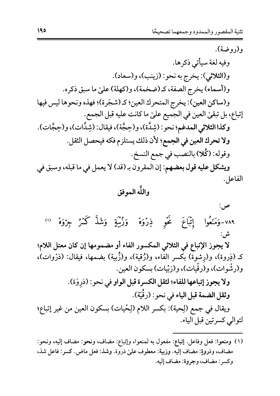 (¬١) ومنعوا: فعل وفاعل. إتباع: مفعول به لمنعوا، وإتباع: مضاف، ونحو: مضاف إليه، ونحو: مضاف، وذروةٍ: مضاف إليه. وزبية: معطوف على ذروة. وشذ: فعل ماض. كسر: فاعل شذ، وكسر: مضاف، وجروة: مضاف إليه.
