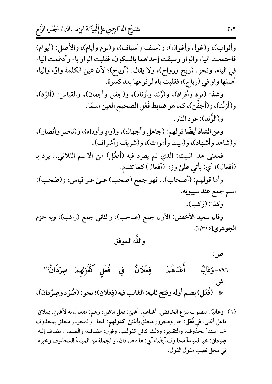 (¬١) وغالبًا: منصوب بنزع الخافض. أغناهم: أغنى: فعل ماض، وهم: مفعول به لأغنى. فِعلان: فاعل أغنى. في فُعَل: جار ومجرور متعلق بأغنى. كقولهم: الجار والمجرور متعلق بمحذوف خبر مبتدأ محذوف، والتقدير: وذلك كائن كقولهم، وقول: مضاف، والضمير: مضاف إليه. صِردان: خبر لمبتدأ محذوف أيضًا، أي: هذه صردان، والجملة من المبتدأ المحذوف وخبره: في محل نصب مقول القول.