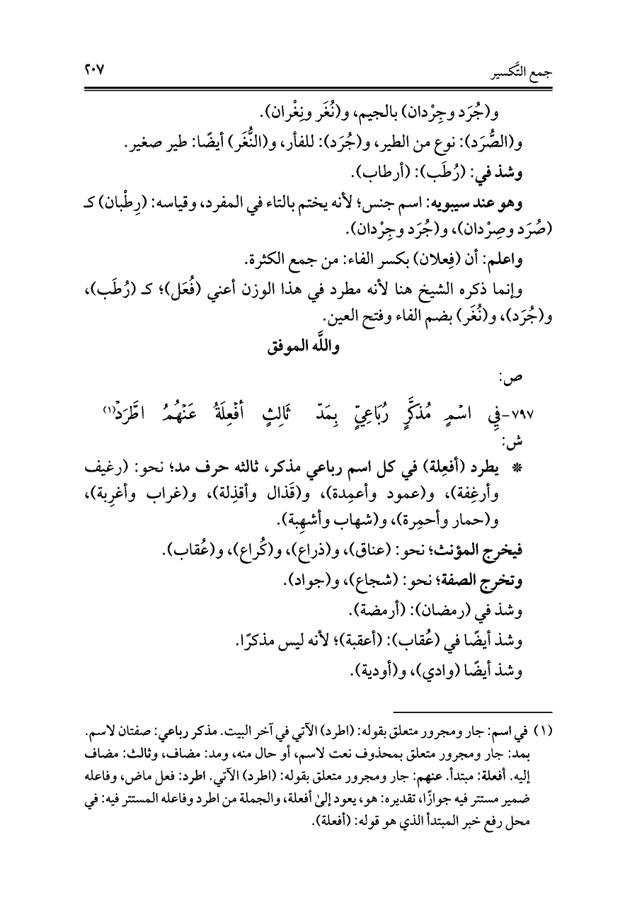 (¬١) في اسم: جار ومجرور متعلق بقوله: (اطرد) الآتي في آخر البيت. مذكر رباعي: صفتان لاسم. بمد: جار ومجرور متعلق بمحذوف نعت لاسم، أو حال منه، ومد: مضاف، وثالث: مضاف إليه. أفعلة: مبتدأ. عنهم: جار ومجرور متعلق بقوله: (اطرد) الآتي. اطرد: فعل ماض، وفاعله ضمير مستتر فيه جوازًا، تقديره: هو، يعود إلى أفعلة، والجملة من اطرد وفاعله المستتر فيه: في محل رفع خبر المبتدأ الذي هو قوله: (أفعلة).