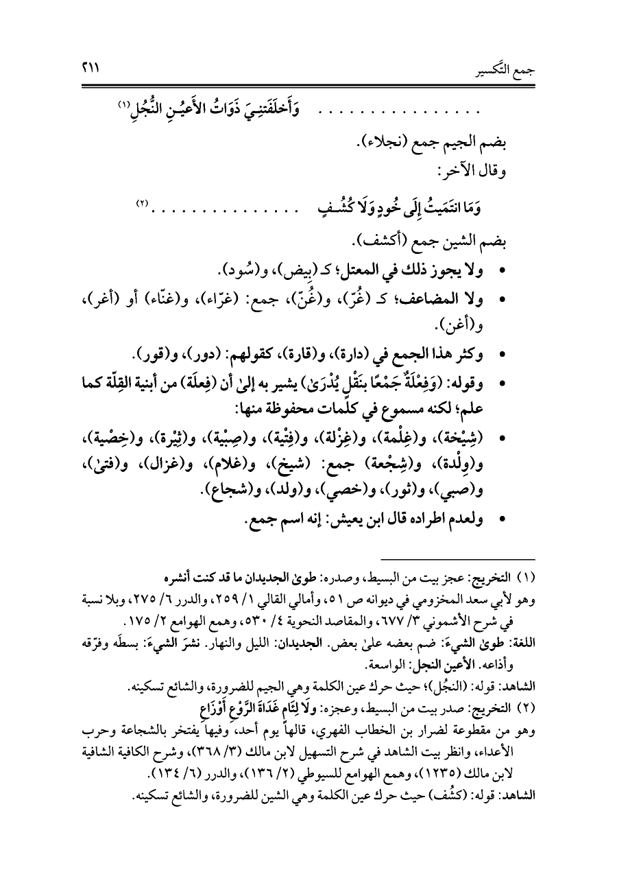 • ولا المضاعف؛ كـ (غُرّ)، و (غُنّ)، جمع: (غرّاء)، و (غنّاء) أو (أغر)، و (أغن).