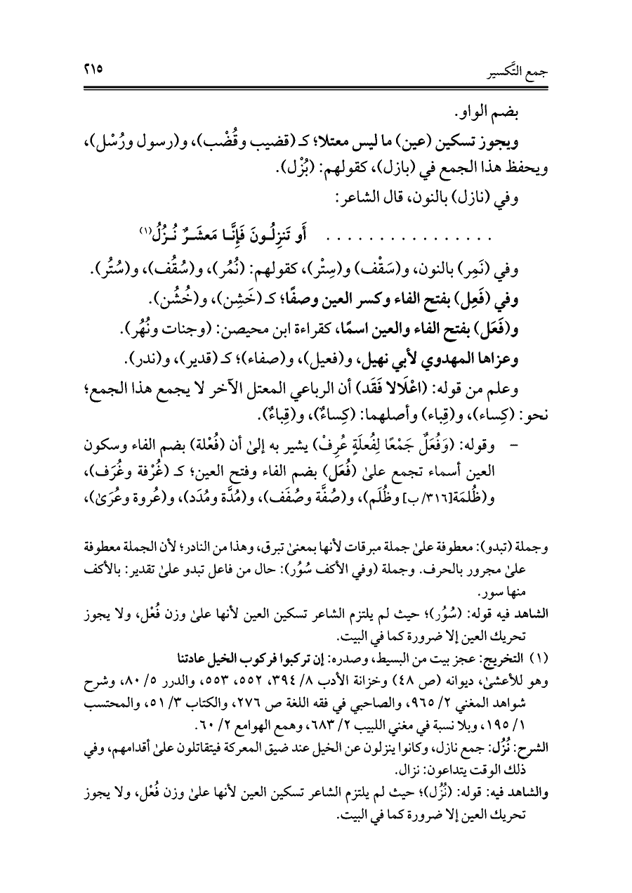والشاهد فيه: قوله: (نُزُل)؛ حيث لم يلتزم الشاعر تسكين العين لأنها على وزن فُعْل، ولا يجوز تحريك العين إلا ضرورة كما في البيت.