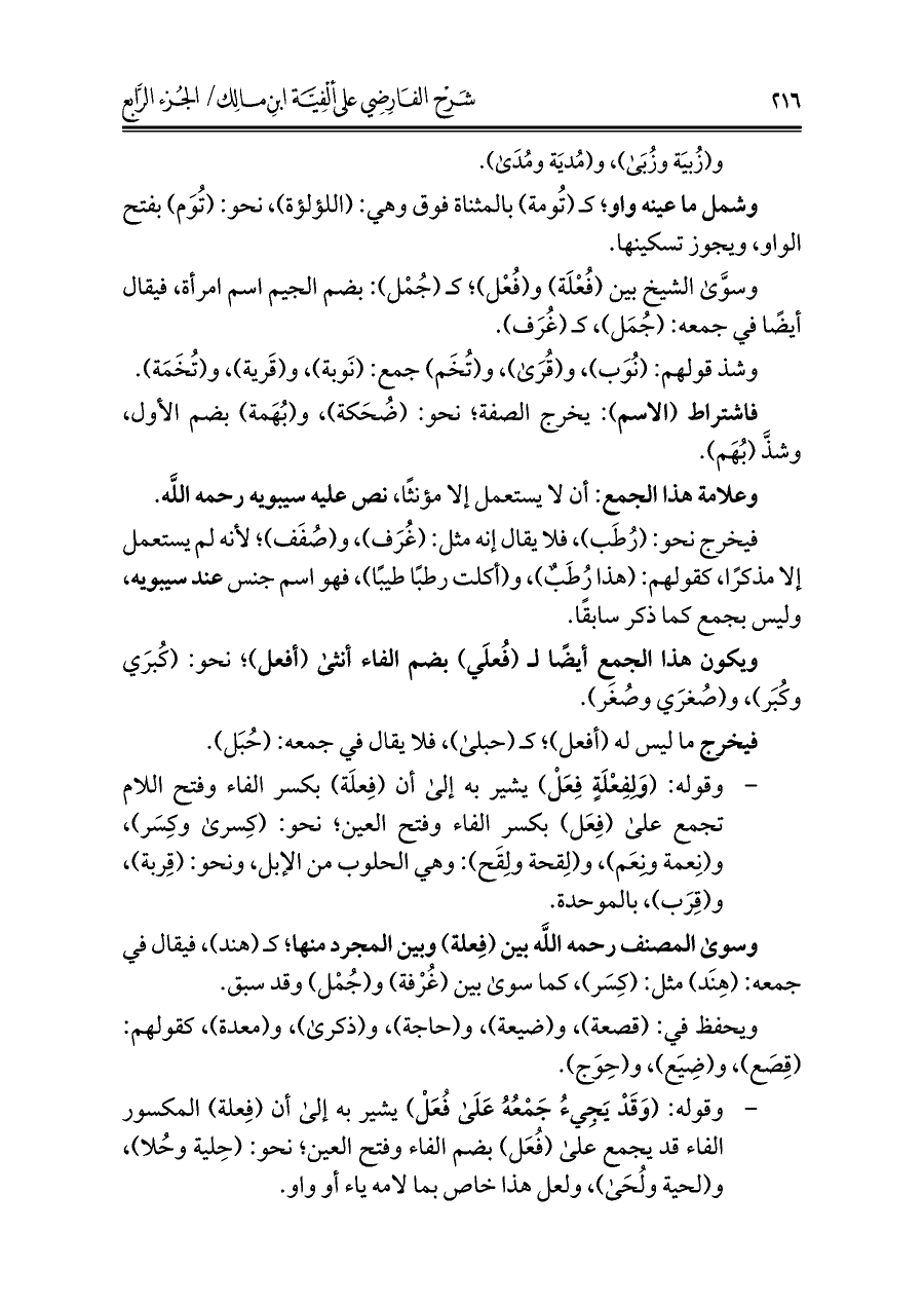 وسوَّى الشيخ بين (فُعْلَة) و (فُعْل)؛ كـ (جُمْل): بضم الجيم اسم امرأة، فيقال أيضًا في جمعه: (جُمَل)، كـ (غُرَف).