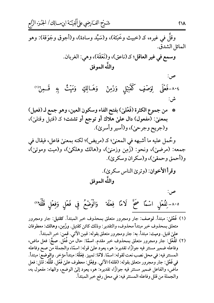(¬١) فَعْلى: مبتدأ. لوصف: جار ومجرور متعلق بمحذوف خبر المبتدأ. كقتيل: جار ومجرور متعلق بمحذوف خبر مبتدأ محذوف، والتقدير: وذلك كائن كقتيل. وزَمِن, وهالك: معطوفان على قتيل. وميت: مبتدأ. به: جار ومجرور متعلق بقوله: قمِن الآتي. قمن: خبر المبتدأ.